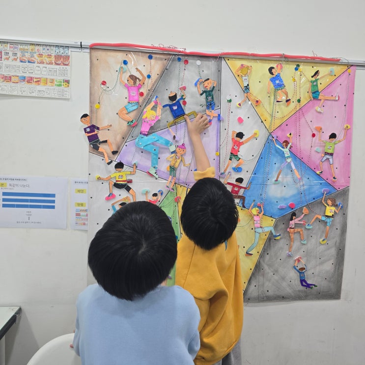 "오늘은 지수가 처음으로 클라이밍 센터에 가는 날이에요. 성벽처럼 높은 벽에는 빨강, 노랑, 파랑 알록달록한 바위(홀드)들이 올록볼록 튀어나와 있었죠. 지수는 먼저 단단한 신발을 신고 벽 앞에 섰어요. '자, 이제 시작이야!' 지수가 오른손을 높이 뻗어 빨간 바위를 꽉 잡았어요. 그러자 팔꿈치가 쭉~ 펴졌죠. 그다음에는 왼쪽 무릎을 가슴까지 높이 들어 올려서 초록색 바위를 밟았어요. 이때 지수의 다리는 'ㄱ'자 모양으로 구부러졌답니다. 지수가 한 발 한 발 올라갈 때마다 몸은 마치 거미처럼 멋지게 변했어요. 어떤 때는 팔과 다리를 대자로 쭉 뻗기도 하고, 어떤 때는 바위에 착 달라붙기 위해 몸을 작게 웅....... <img src="https://blogthumb.pstatic.net/MjAyNjAxMTlfMTQz/MDAxNzY4Nzk3NzE3MTMx.ixGtrISxWk95Fz-KY9DV6ViNMebOM-5f2eZmm1w8oTkg.B2wL0giBlZvPce2GkZA7bx3VejuNm__LV8cZVvHM87Qg.JPEG/1000029660.jpg?type=s3" />