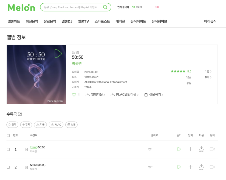 서면실용음악학원 학원생 음반발매 '박하연 - 50:50'/알소동보컬 작곡 프로듀싱 미디작곡학원