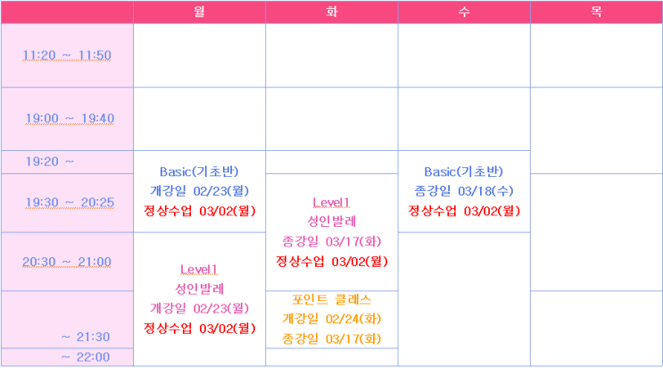 방문 상담X / 전화 상담O - 월요일~수요일 PM 4:00 ~ 7:00 가능. *목금토일 휴무 <필독> 등록 전에 반드시 본원 블로그 게시글(최소한 공지 글이라도)을 꼼꼼히 읽고, 발레의 본질을 이해한 뒤 등록해 주시기 바랍니다. 블로그 글을 많이 읽고 오셨다는 분들은 클래스에 임하는 태도부터 확연히 다르며, 그에 따른 피드백의 결과 또한 탁월합니다. 부디 발레가 무엇인지, 그리고 어떤 마음가짐과 자세로 임해야 하는지 만큼은 꼭 숙지하신 후 등록해 주시기 바랍니다. 태도가 모든 것을 결정합니다. Attitude is everything! ★ 03월 취미 발레 클래스 수강신청 기간! 등록 마감일 02/10(화)까지 ★ ※ 먼저 아래 "클래스 스케줄....... <img src="https://blogthumb.pstatic.net/MjAyNjAxMjhfMTA1/MDAxNzY5NTg2NzE1Njg0.Wk75HzLiV5Ny4rhMsmXsA_uvf83XDtMKmupf9pXZ_Kgg.FyRAHopkda8zA48nDG4znh65c-081iUC1kCqBHUN2ckg.PNG/3%BF%F9_%BD%C3%B0%A3%C7%A5.png?type=s3" />