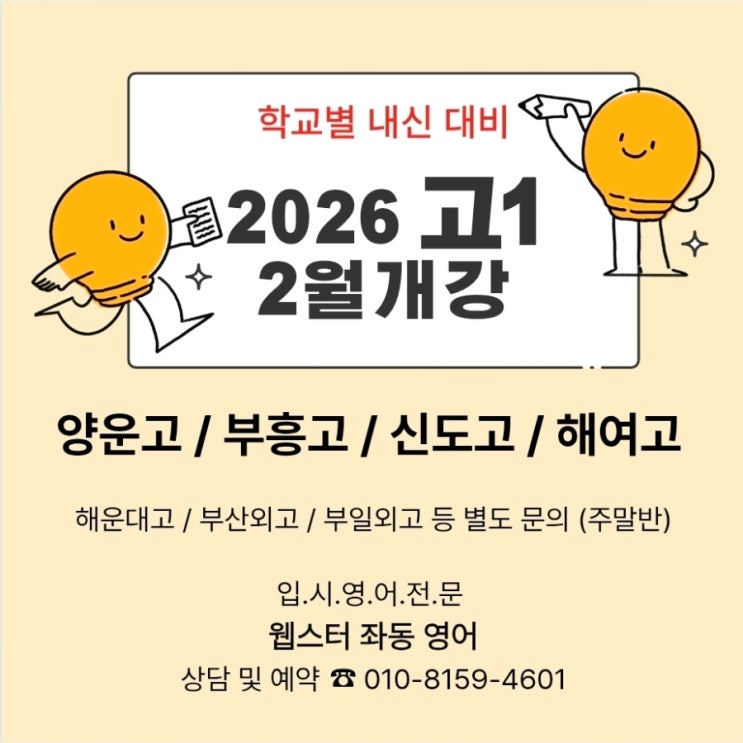 ■ 2026 고1 수업 안내 ■ - 학교별 내신 대비 (교과서 / 부교재 / 모의고사 등) - 정규 강의 + 개별 학습 - 소수 정예 + 원장 직강 - 흐름 독해 + 5복 노트 - 어법(문법) + 서술형 대비 정확한 이해를 바탕으로 암기 적용 반복 학습 동반자 웹스터 좌동 영어 (입시.영어.전문) 상담 및 예약 010-8159-4601 <img src="https://blogthumb.pstatic.net/MjAyNjAyMDJfMjk1/MDAxNzcwMDQyNzE0ODY3.tB28ywXy0ia8Kj3tj2M2MeO9gO5OIu3ilD1INxeQ4Tkg.2MAnA-JlSuFKnLHdaq9gAFTLQFylbn_My_4I-64QJKsg.JPEG/900%A3%DFScreenshot%A3%DF20260202%A3%DF231933%A3%DFSamsung_Internet.jpg?type=s3" />