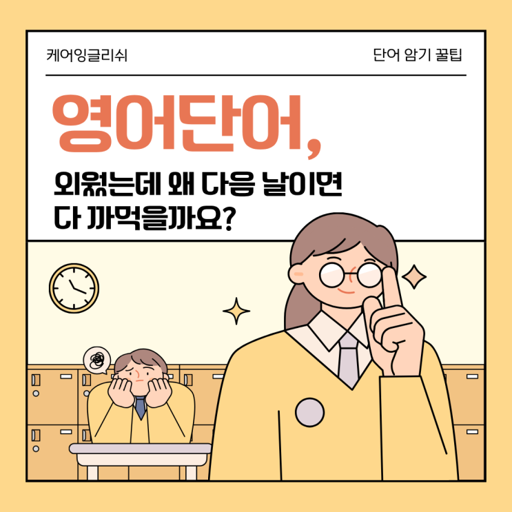 안녕하세요! 케어잉글리쉬입니다. 오늘은 영어 공부의 꽃이라고 할 수 있는 영단어 제대로 외우는 방법에 대해 이야기를 나눠보려 합니다. 어제 분명 50개 외웠는데… 오늘 시험 보니까 절반도 기억이 안 나요. 학생들이 가장 많이 하는 말 중 하나입니다. 분명 시간을 들여 외웠는데, 막상 시험을 보면 생각이 나지 않는 이유. 사실 암기를 못 해서가 아니라 ‘기억하는 방식’이 잘못되었기 때문입니다. 많은 학생들이 단어를 이렇게 공부합니다. 눈으로 여러 번 읽기 형광펜 긋기 하루에 몰아서 암기하기 하지만 이런 방법은 대부분 단기기억에만 남습니다. 시험이 끝나면 금방 사라지는 이유죠. 단어는 ‘많이 보는 것’보다 직접 꺼내 쓰고....... <img src="https://blogthumb.pstatic.net/MjAyNjAyMDVfMTQy/MDAxNzcwMjU4MjY0NzM0.m_6k6e8Mz6_1FigLsNLyFThBfYNpE728jQzrG6q8ZK0g.0gDOCw4XmoftlLXEZrk-UnZ43l7-MfaWweC9I3EIJJ0g.PNG/1.png?type=s3" />