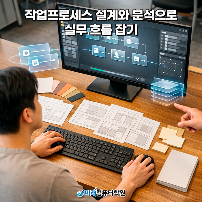 1. 국비지원으로 시작하는 출판 편집디자인 실무 편집디자인은 감각만으로 버티기보다 작업 순서를 알고 도구를 제대로 쓰는 게 핵심입니다. 미래컴퓨터학원은 부산 국비지원 국비지원학원 과정으로, 내일배움카드로 수강료 부담을 크게 낮추고 실무 중심으로 배우도록 구성했습니다. 기초가 없어도 따라올 수 있게 화면 구성부터 차근차근 잡아드리고, 실습 위주로 결과물이 남는 수업 흐름으로 진행됩니다. 훈련장려금을 받을 수 있는 제도도 함께 안내받을 수 있어요. 2. 작업프로세스 설계와 분석으로 실무 흐름 잡기 현업에서 가장 많이 막히는 지점이 기획부터 제작까지 순서가 뒤엉키는 순간입니다. 이 과정에서는 편집디자인 작업프로세....... <img src="https://blogthumb.pstatic.net/MjAyNjAxMTlfMTQy/MDAxNzY4NzkzNjEzMDEw.kH9E1NHTqQ2Tlm_V8NPLw2R5sLzye4doMMcWVjCuOnIg.TQ_FLoGxjHcTvdrl5nmFDilc9dj60ODTnCvLvCjuksQg.PNG/%BE%C6%C6%AE%BA%B8%B5%E5_2.png?type=s3" />