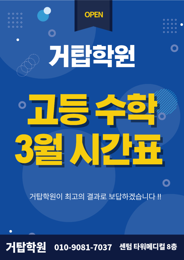 안녕하세요! 꼼꼼한 관리와 높은 성적 향상률로 입소문 난 거탑수학입니다. 신학기를 맞이해 거탑수학의 3월 개강 시간표를 안내해 드리겠습니다. 거탑학원과 함께 꼼꼼하게 준비하여 자신 있는 새 학기를 맞이하시길 바랍니다. 이번 학기도 최선을 다해서 최고의 결과로 보답하겠습니다 !! << 고1. 2 시간표 >> << 고3 수능 수업>> << TOP CLASS : 개별 맞춤 수업 >> [수강 신청 및 문의] ☎ 051.703.7999 / 010-9081-7037 (문자 신청시 학교/학생명 필수 기재) # 해운대고국어 #해운대고수학 #센텀고국어 #센텀고수학 #부일고국어 #부일고수학 #센텀수학 #센텀국어 #해운대국어 #해운대수학 #센텀중등수학....... <img src="https://blogthumb.pstatic.net/MjAyNjAyMTBfMjIg/MDAxNzcwNzAyNTMzNTg1.lytWH23edT6ep7MlmIe9UdAUD_8HVZPLZ3e4U7uhMJUg.6iVThqz02YIU9JPM3bg_UqJ3_IAIpw9rLq9eRu2tqrog.PNG/%C1%DF%B5%EE_%BC%F6%C7%D0_%B0%B3%B0%AD%C6%F7%BD%BA%C5%CD.png?type=s3" />