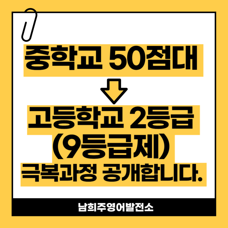 안녕하세요 대원고 영어전문 남희주 영어발전소입니다. 신학기가 되며 새로운 학생들을 만나고, 각기 다른 고민과 이야기를 나눌 기회가 많아졌습니다. 그 과정에서 유독 인상 깊었던 한 학생의 사례가 있어 오늘은 이를 블로그에 기록으로 남기고자 합니다. 오늘은 중학교 시절 영어 성적이 50점대였던 한 학생이, 고등학교에 올라와 4등급에서 단 한 학기 만에 2등급으로 상승한 사례를 공유하려고 합니다. 그럼 영어 공부를 아예 안 한거야? 아..수학, 과학은 좋아하는데 영어는 정말 자신이 없었어요. 단어 암기도 너무 어렵고요. 그냥 꾸준히 하는 것조차 힘들었어요. 이 학생은 제자였던 졸업생의 동생이었습니다. 중2가 되면서 영어가 너....... <img src="https://blogthumb.pstatic.net/MjAyNjAxMTdfMTg0/MDAxNzY4NTgzMjEyMTU0.9gf-7DpQ8-vh0kgyJ4TZn-psnLQ7YcrezmNupT3jhnIg.-ROKBcqZ8540OSYKxaQDZfPcGtmNzPvUewBszmDANlIg.PNG/%C1%A6%B8%F1%C0%BB_%C0%D4%B7%C2%C7%D8%C1%D6%BC%BC%BF%E4_-001_%281%29.png?type=s3" />