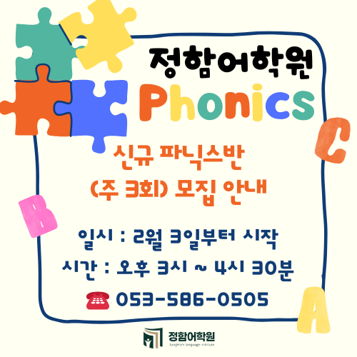 안녕하세요. 정함어학원입니다. 2026년 파닉스반 개강 모집 안내합니다:) 요일은 화, 수, 금 시간은 3시 ~ 4시 30분(90분) 입니다. 교재는 자체 교재로 학원에서 제공합니다:) 2026년 2월 3일(화)부터 시작 예정입니다. 파닉스 수업, 왜 중요할까요? 영어를 처음 시작하는 아이들에게 가장 중요한 것은 무작정 단어를 외우는 것보다 ‘읽는 방법’을 제대로 배우는 것입니다. 파닉스(Phonics)는 알파벳의 소리와 규칙을 체계적으로 익혀 아이 스스로 단어를 읽고 발음할 수 있는 힘을 길러주는 영어 기초 과정입니다. 파닉스를 배우면 달라집니다 ✔ 알파벳 소리를 정확하게 익혀요 ✔ 처음 보는 단어도 스스로 읽을 수 있어요 ✔ 발음....... <img src="https://blogthumb.pstatic.net/MjAyNjAxMjFfOTYg/MDAxNzY4OTg1Nzk0NTYz.RG8dMzSH91fjE2W9HT_-d6yQUXvFsOLGw6Pjccae4xcg.HRO7u1Yi9L7jM_oVIB4069LChSpM9uF6iwUCfnbuc8cg.PNG/123.png?type=s3" />