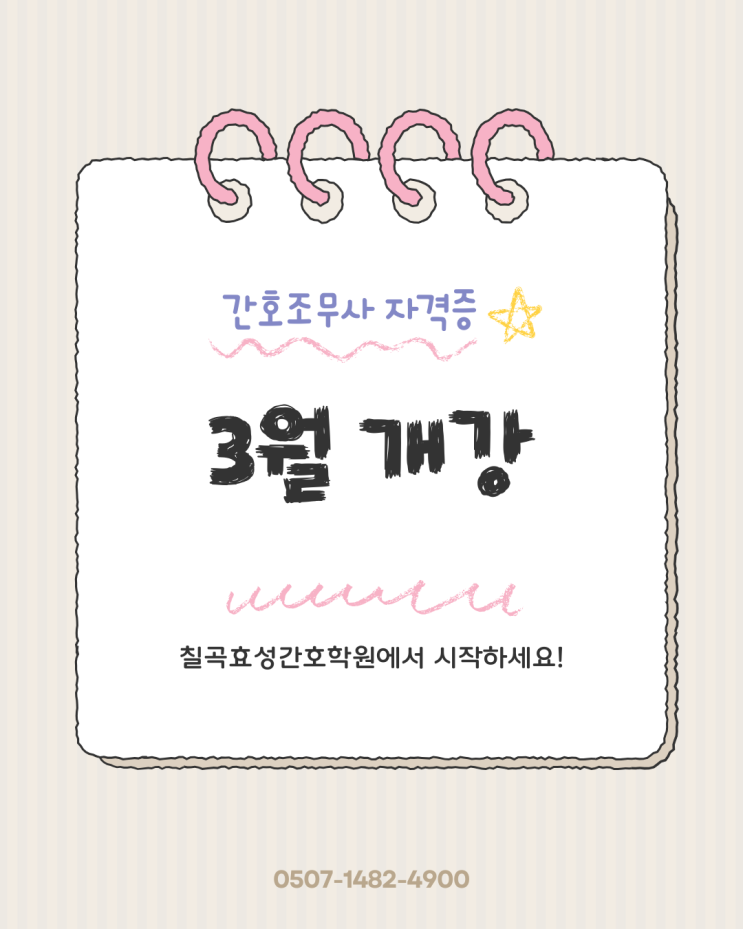 새로운 계절이 시작되는 3월은 새로운 도전을 결심하기에 가장 좋은 시기입니다. 칠곡 효성간호학원에서는 3월 개강을 맞아 간호조무사를 꿈꾸는 분들을 위한 체계적인 교육 과정을 운영합니다. 안정적인 직업과 꾸준한 수요로 주목받는 간호조무사, 이제는 제대로 된 교육 환경에서 준비해 보세요. 칠곡 효성간호학원은 기초 이론부터 국가시험 대비, 실무 중심 교육까지 탄탄한 커리큘럼을 갖추고 있습니다. 간호 분야가 처음인 분들도 이해하기 쉽도록 단계별 수업으로 진행되며, 반복 학습과 핵심 정리를 통해 자연스럽게 실력을 쌓을 수 있도록 돕습니다. 단순 암기식 수업이 아닌, 실제 의료 현장에서 활용 가능한 내용 위주의 교육이 이루....... <img src="https://blogthumb.pstatic.net/MjAyNjAxMjNfMTQ0/MDAxNzY5MTQ1NTg1NjUw.AvhnpNuW1AVyeVJ6ax23aQfdXT-w795XgVEZUEdE2yUg.TBTQA3TcZSYpurQBtaHIJ8kE9drMbqS5mggm4neJheEg.PNG/%C4%A5%B0%EE%C8%BF%BC%BA%B0%A3%C8%A3%C7%D0%BF%F83%BF%F9%B0%B3%B0%AD_.png?type=s3" />