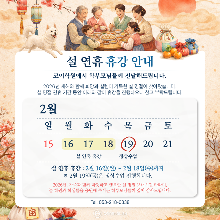 만촌동영어학원 코이영어 2월 설 연휴 휴강 안내드립니다.