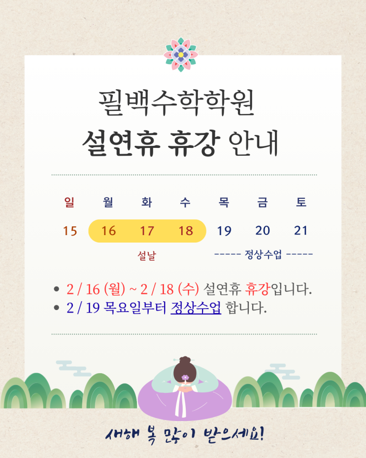 필백수학학원 설연휴 휴강 안내 2/16(월) ~ 2/18(수) 3일 동안 휴강입니다. ✔️2월 19일 목요일✔️ 정상적으로 수업이 진행되니 착오 없으시길 바랍니다! 새해 복 많이 받으세요❤️ <img src="https://blogthumb.pstatic.net/MjAyNjAyMDZfMTQy/MDAxNzcwMzcwNTA0ODgz.uihcH53ZIYtm2OMRJNKUsuU-PVImKVWo2wLfS3qAe1kg.M_IBPS8bwSDIdw5Sfg_rS_yWTeQWnKTol77yRw6DnRUg.PNG/%BC%B3%BF%AC%C8%DE%BE%C8%B3%BB.png?type=s3" />