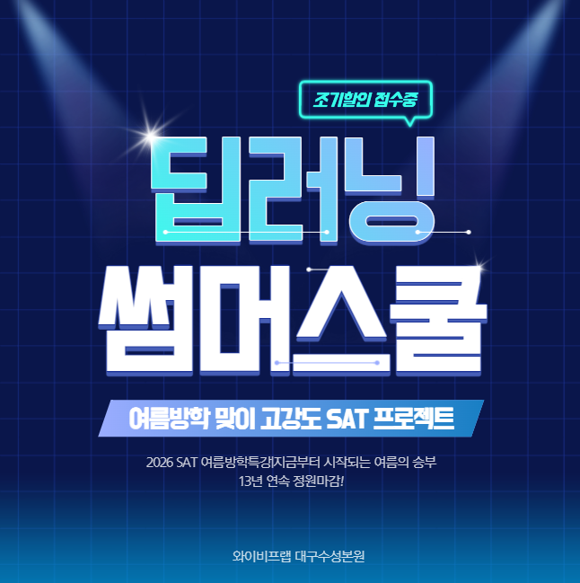 대구국제학교 학생이라면, 이번 여름은 와이비프랩에서! 여름방학은 국제학교 학생들에게 학업을 한층 끌어올릴 수 있는 절호의 기회입니다. 특히 SAT와 Essay, Academic Writing의 기본기를 다져야 할 시기라면, 단기간에 집중 학습이 가능한 방학 시즌을 절대 놓쳐서는 안 됩니다. 대구 수성구에 위치한 와이비프랩은 13년간 대구 국제학교 학생들의 해외대학 진학을 전문적으로 이끌어온 SAT·AP·TOEFL 명문 학원입니다. 영어로 수업이 가능한 것은 물론, 미국 아이비리그 출신 원장이 직접 수업을 진행합니다. 여름방학, SAT 고득점 도약의 골든타임 여름특강은 단순한 문제풀이가 아닌, Reading·Writing·Math 세 영역을 균형 있게 훈련시키는....... <img src="https://blogthumb.pstatic.net/MjAyNjAxMzFfMjE4/MDAxNzY5Nzg5MTY0NTgy.y5RHhuekCD9KocrcHO6hN832HzXqoyW9lOxrkkfMAUYg.8j8Wmp7pkuSMmeRT2vn3PhUmWZ5ocGd94NJ_OK8hA9gg.PNG/image.png?type=s3" />