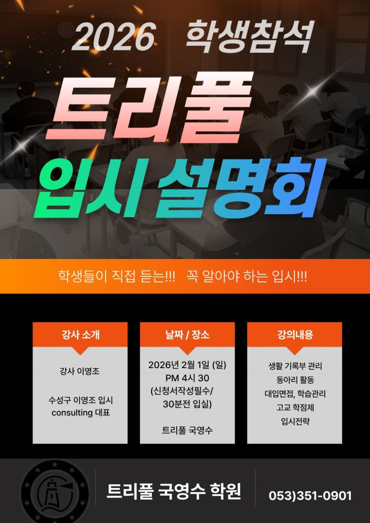 침산동 단과학원 트리풀 국영수학원입니다. 일요일 늦은 저녁, 무거운 가방을 내려놓고 트리풀의 아이들이 모인 이유 추운 겨울, 새벽에 눈 소식까지 있던 어제 일요일 오후. 고1, 고2 학생들에게 이 시간은 집에 가서 쉬고 싶거나 친구들과 맛있는 걸 먹으며 쉬고 싶은 유혹이 가장 큰 때입니다. 하지만 [1일 일요일] 저녁, 2월의 첫째날. 우리 침산동 트리풀국영수학원의 홀은 그 어느 때보다 뜨거운 열기로 가득 찼습니다. 학원 수업이 없는 데도 가방을 멘 채 학원 문을 열고 들어오는 아이들의 모습을 보며 트리풀의 선생님들은 마음 한구석이 따듯해졌습니다. "누가 시켜서가 아니라, 정말 내 미래가 궁금해서" 강제적이지 않은....... <img src="https://blogthumb.pstatic.net/MjAyNjAyMDJfMjYz/MDAxNzcwMDIzNzIyMTE0.gjjuEzykYAAxtmHl01iUXZmNBsDWDUjF63ciLNRruNYg.jPzbK_kVN4-hq1AvTjxeQyk2YPwnl0teoyMZ0jZl5YIg.JPEG/%3F%9E%85%3F%8B%9C.jpg?type=s3" />