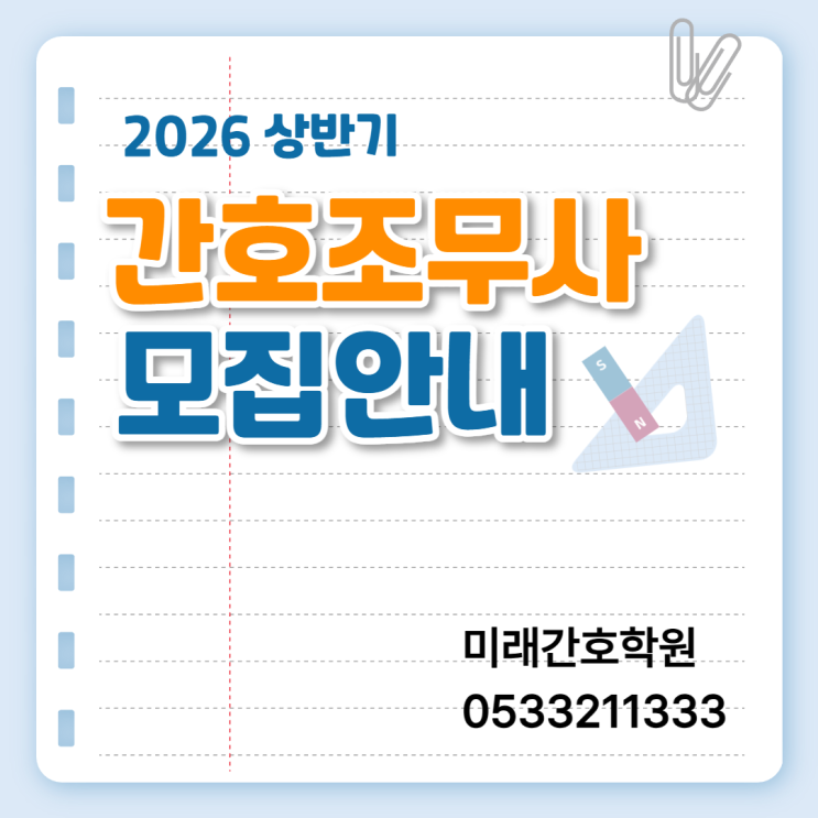 #미래간호학원 #국가고시 #대구요양보호사학원 #미래탑간호학원 #요양등급신청 #내일배움카드 #간호조무사 #내일배움카드 #대구요양보호사교육원 #간호조무사실습복 #간호조무사실습준비물 #대구칠곡요양보호사학원 #미래탑간호 #내일배움카드모바일신청 #대구요양보호사시험장 #야간요양보호사교육원대구 #칠곡요양보호사 #국민내일배움카드모바일신청 #병원동행매니저 안녕하세요. 대구 북구 칠곡에 위치한 미래간호학원입니다! 2026년도 상반기 간호조무사 자격취득 과정 훈련생을 모집하게 되어 소식 전해드립니다~~ 이번 과정은 정원 40명으로 운영되며, 국비지원이 가능해 교육비 부담을 줄이고 전문 자격증 취득에 도전할 수 있는 좋은 기....... <img src="https://blogthumb.pstatic.net/MjAyNjAyMDNfODMg/MDAxNzcwMDkxNDIxMDEw.uwRFg1EBuEyUxiJKSvoM3t_-D4Yn0hHvbNL0TFrVUwMg.dJ_lw2u-UZ5NtnoEcFG-fJ7RLO8OWNodhZQ8H6z0R4Ag.PNG/%C1%A6%B8%F1%C0%BB_%C0%D4%B7%C2%C7%D8%C1%D6%BC%BC%BF%E4_-001_%288%29.png?type=s3" />