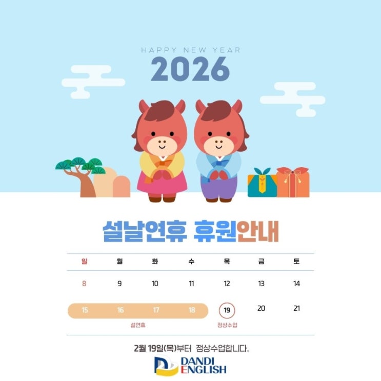 동도초 후문 앞 단디영어의 2026년 병오년 설날 연휴 안내 드립니다. 안녕하세요? 어느덧 2026년 병오년 설날이 코앞으로 다가왔네요. 새해가 밝은 지 얼마 안 된 것 같은데 벌써 우리의 큰 명절, 설날이 다가오고 있다니 정말 시간이 빠르죠? 올해는 특별히 붉은 말의 해, 병오년이에요. 말처럼 힘차게 달려가는 한 해가 되길 바라는 마음으로, 오늘은 다가오는 설날 연휴 일정에 대해 자세히 안내해드리려고 해요. 올해 설날 연휴는 주말과 맞물려 있어서 어떻게 보면 조금 아쉽기도 하고, 또 어떻게 보면 푹 쉴 수 있는 좋은 기회가 될 수도 있을 것 같아요. 그럼 자세한 일정을 함께 살펴볼까요? 설날 연휴 일정 2월 16일(월요일)~ 2월 18일....... <img src="https://blogthumb.pstatic.net/MjAyNjAyMDhfMTUw/MDAxNzcwNTYwNjMyMzk3.u-M5H23nh-utog7DV-F-HBvtdHKGX-Ppy-_Elws6kuog.AMdAJKrvpb4VUqJWjawmHSTXifGRF72_kAIl1Y9HgZcg.JPEG/900%A3%DF%BF%AC%B3%EB%B6%FB_%BA%EA%B6%F3%BF%EE_%B1%CD%BF%A9%BF%EE_%BA%D3%C0%BA_%B8%BB_%C4%C9%B8%AF%C5%CD_%C0%CF%B7%AF%BD%BA%C6%AE_%BA%B4%BF%C0%B3%E2_%BB%F5%C7%D8_%BC%D2%BF%F8_%C0%CE%BB%E7%B8%BB_%C0%CE%BD%BA%C5%B8%B1%D7%B7%A5_%C6%F7%BD%BA%C6%AE%A3%DF20260208%A3%DF232244%A3%DF0000.jpg?type=s3" />