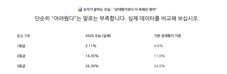 안녕하세요, 영어 입시의 든든한 중심 키스톤 영어학원입니다. 최근 발표된 2026학년도 수능(2025년 11월 시행) 등급표를 보고 많은 학부모님과 예비 고3 학생들이 충격에 빠졌습니다. 영어가 절대평가로 전환된 이후, "영어는 어느 정도만 하면 1~2등급은 나오겠지"라는 생각이 얼마나 위험한지 수치가 증명했기 때문입니다. 단순히 "어려웠다"는 말로는 부족합니다. 실제 데이터를 비교해 보십시오. 보이십니까? 1등급 비율이 상대평가 1등급 컷(4%)보다 훨씬 낮습니다. 이는 영어가 더 이상 '보너스 과목'이 아니며, 2등급과 3등급을 맞는 것조차 예전만큼 쉽지 않다는 것을 의미합니다. 사실상 이름만 절대평....... <img src="https://blogthumb.pstatic.net/MjAyNTEyMThfMjY5/MDAxNzY2MDQ1MjU2NTQ5.YZrN4R5_ZHE0k0AMhc4l8FfXoxIaKMnexgpSBJGdeXQg.aAQOdOip79nu4eoLN35GESZDoCXeoYzbgv0owkbGoHgg.PNG/%BD%BA%C5%A9%B8%B0%BC%A6_2025-12-18_%BF%C0%C8%C4_5.07.16.png?type=s3" />