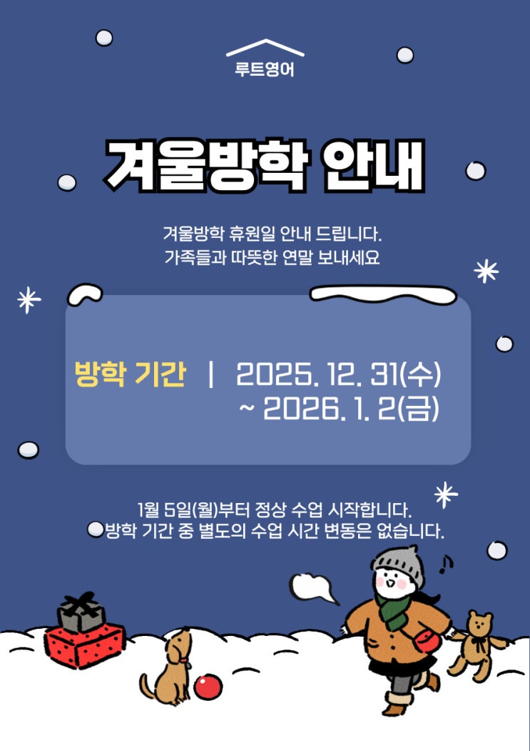 안녕하세요. 루트영어입니다. 2025년 겨울방학 일정 안내드립니다 방학 기간동안 별도의 시간 변동과 특강 수업은 없으며 여름방학에 이어 겨울방학 원서 읽기 프로젝트를 진행할 예정입니다. 따뜻한 연말보내세요:) <img src="https://blogthumb.pstatic.net/MjAyNTEyMTVfMjcz/MDAxNzY1NzcyNjI0MjEx.6Q8K_4VWeGMTQqWapT8gYRZp6IrikfyRCNNpLx40sbsg.fmmVif3zWmtFKtwMoBZC1V2TlEUNNi8wtfo2Jl3gZYcg.JPEG/%C1%A6%B8%F1%C0%BB-%C0%D4%B7%C2%C7%D8%C1%D6%BC%BC%BF%E4_-001_%2851%29.jpg?type=s3" />