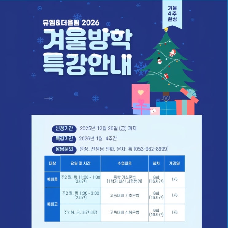 뮤엠&더올림영어학원 26년도 겨울방학 특강안내