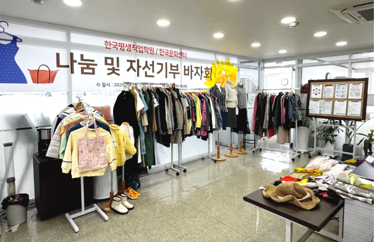한국평생직업학원 / 한국문화센터 대구중앙지부입니다 :-) 2025년 12월 12일(금) 본 기관에서 나눔 및 자선기부 바자회를 개최하였습니다. 이 전 바자회는 물품 나눔만을 진행하는 바자회로 개최했었는데 이번에는 좋은 취지를 위해 기부바자회를 개최하자는 훈련생들의 의견에 동감하여 나눔 및 자선기부 바자회를 개최하게 되었습니다. 작아진 아이 옷부터 가방, 머플러 등 장롱속에 잠자고 있던 많은 물품들이 새로운 주인을 찾아갔습니다. 많은 훈련생들의 활발한 행사 참여 덕분에 기관이 소재한 대구 동구 방촌도 행정복지센터를 통하여 바자회 수익 전체를 '이웃돕기 성금'으로 전달하였습니다. 이런 뜻 깊은 행사에 동감하고 참....... <img src="https://blogthumb.pstatic.net/MjAyNTEyMjJfMTAy/MDAxNzY2Mzc2NzAxMzQ2.3oTdgAOpxNDCnsicNvtY5Lc9qcVhF-d6X_yFakf1OqUg.8TVl_B32-fcGF0Mqz0LrusP-RAEbpgJZTRFu7IG-0Nog.PNG/%B9%D9%C0%DA%C8%B8.png?type=s3" />