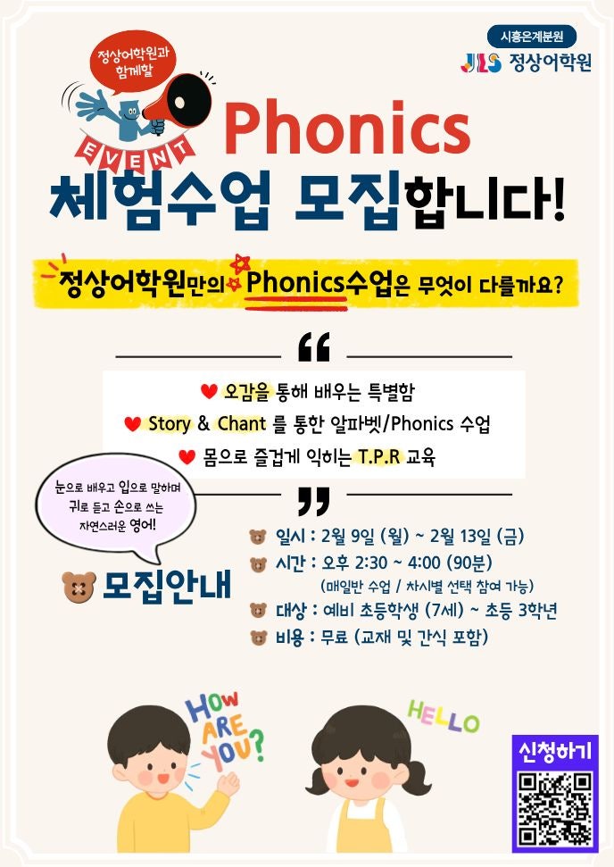 안녕하세요. 정상어학원 시흥은계분원입니다. 신학기를 앞두고 정상어학원 시흥은계분원에서 다양한 혜택과 이벤트를 준비하였습니다. 먼저, 첫 번째! Phonics 체험학습 이벤트 파닉스(Phonics)는 단순히 알파벳을 외우는 수업이 아닙니다. '글자와 소리의 규칙을 연결해 가는 과정' 입니다. 그럼, ✨정상어학원의 Phonics 수업은 무엇이 특별할까요? 오감을 통해 배우는 특별함 눈으로 배우고, 입으로 말하며, 귀로 듣고, 손으로 쓰는 알파벳! 그로 인해 단어를 외우는 아이가 아닌, 단어를 읽고 이해하는 아이로 성장합니다. Story & Chant 를 통한 알파벳/파닉스 수업 소리와 리듬에 차근차근 익숙해질 수....... <img src="https://blogthumb.pstatic.net/MjAyNjAxMTVfMjQg/MDAxNzY4NDc0MTcwMjQx.V8rhJB0R0WxSq7izaUb3HqzeTirZOl8ZjGYh7rCINAQg.fr7UQsTBR5soOrRWQZTVyhFXCwSRAwwApEVbZKNgt7og.JPEG/phonics_%C3%BC%C7%E8.jpg?type=s3" />