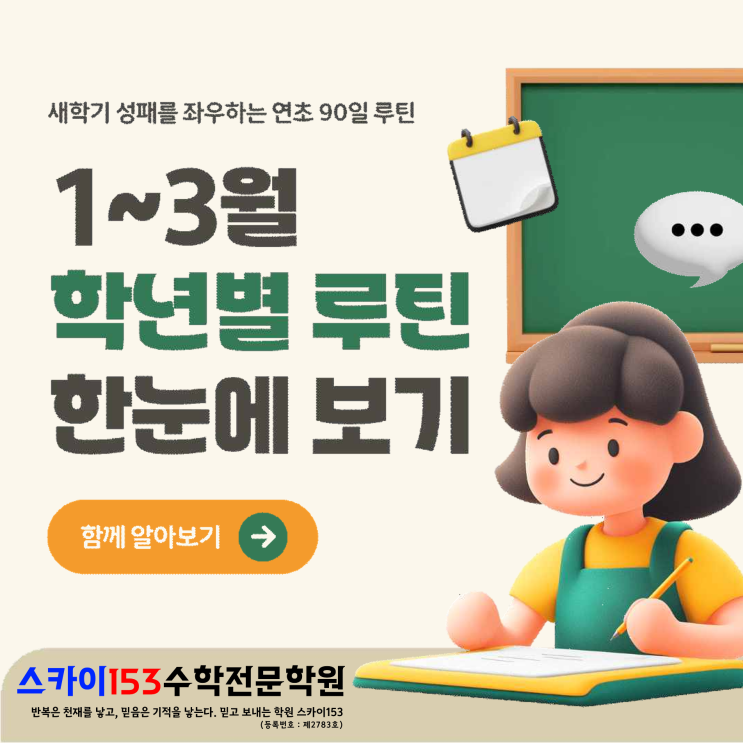 안녕하세요, 스카이153수학전문학원입니다. 어느덧 한 해의 시작인 1월이 중반을 지나고 있는데요. 연초 3개월의 선택이 아이들의 1년, 나아가 진로를 바꿀 수 있다는 사실, 알고 계셨나요?새 학기 준비로 분주할 학생과 학부모님들을 위해, 1월부터 3월까지의 학년별 필수 루틴을 정리해 드립니다. 3개월의 의미 1월, 2월, 3월은 1. 생활 리듬이 결정되는 시기 : 방학 동안 흐트러졌던 생활 패턴을 바로잡고, 새 학기에 적응할 수 있는 공부 근육을 만드는 시기입니다. 2. 학습 격차가 처음 벌어지는 구간 : 이전 학년의 부족한 부분을 보완하고 다음 학년을 예습할 수 있는 마지막 기회입니다. 3. 학교 기록(생기부, 활동)의 출발점 : 학년이 시....... <img src="https://blogthumb.pstatic.net/MjAyNjAxMTRfNTEg/MDAxNzY4MzcwNjgxNjY2.wEck1t_k1WaR5EIZl6SxAYjmmJ7b4WbIspYwSnmd9kIg.uwxY3Iw5J9cb3ngursxeszidF3n5V-8K0qZvIM27dt4g.PNG/%C0%CC%C1%EE%C0%AF_13%BF%F9_%B7%E7%C6%BE_%C4%AB%B5%E5%B4%BA%BD%BA_1.png?type=s3" />