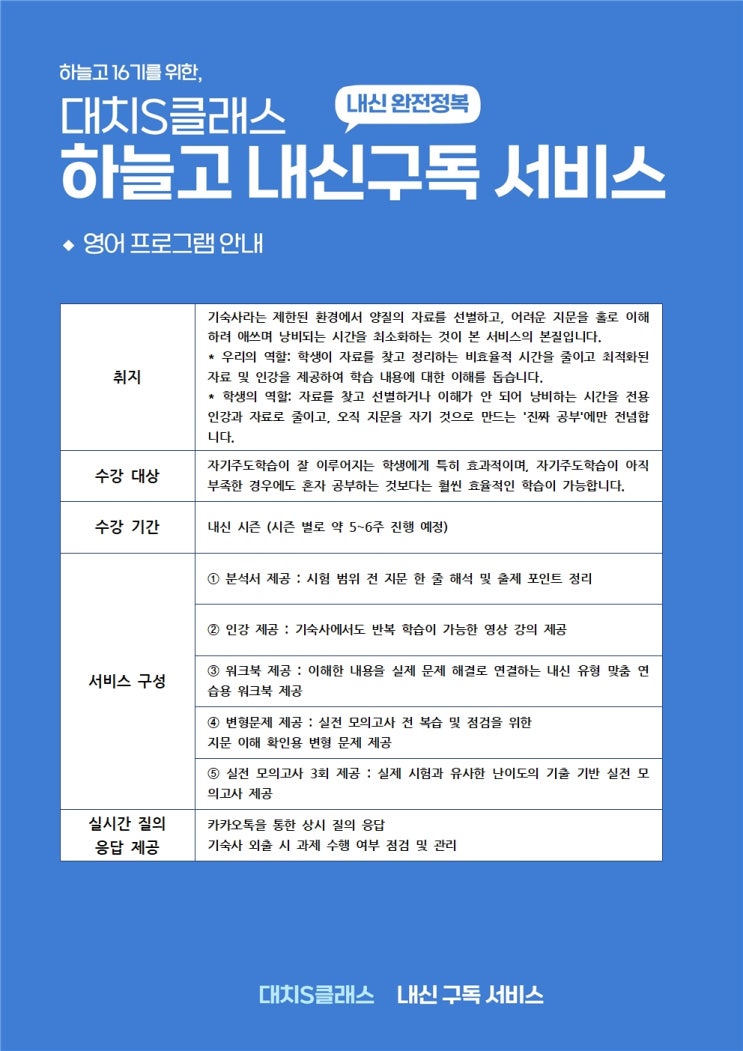 하늘고 합격을 진심으로 축하합니다! 하늘고 합격은 끝이 아니라 본격적인 내신 레이스의 시작입니다. 하늘고 내신은 범위와 난이도, 자료의 양이 모두 많기 때문에 초반부터 방향을 잘 잡는 것이 무엇보다 중요합니다. 대치S클래스의 하늘고 내신 구독 서비스는 기숙사 환경이라는 제한된 상황 속에서도 학생이 효율적으로 내신을 준비할 수 있도록 설계된 프로그램입니다. *수학 : 김보건 현) 대치S클래스클래스 원장 전) 이투스 온라인 / 청솔학원 (목동, 강북, 일산) / 대치 명인학원 / 대치 이강학원 / 목동 사과나무학원 등 저서) 개념한수, 내신한수, 블랙라벨, 통이 큰 기출 *영어 : Kelly 현) 대치S클래스 대표강사, 유튜브 TV 운영 (현....... <img src="https://blogthumb.pstatic.net/MjAyNjAxMjhfMjQx/MDAxNzY5NTc5OTAyMzg0.cr_6NsJp3LHEQGtrmJDHBnAKISHEQiRJGNbKc8br860g.vb1z5NUXU4osJLiaZCvjCclFDvfw9Zy_WZ6gOZCINl4g.JPEG/%B3%BB%BD%C5%B1%B8%B5%B6%BC%AD%BA%F1%BD%BA_%BF%F8%BA%F1%BE%F8%B4%C2%B0%C5001.jpg?type=s3" />
