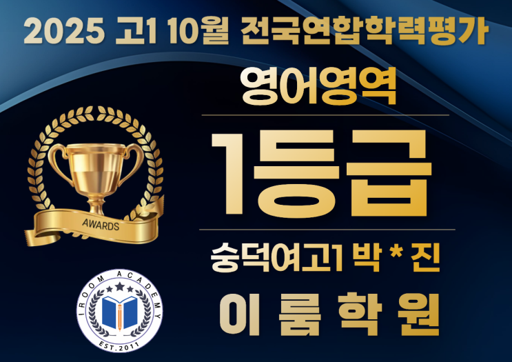 2025년 10월, 이룸학원 학생들이 빛나는 성적을 만들어냈습니다. 아래는 그 주인공들입니다. 꾸준한 노력과 정진에 박수를 보냅니다~ 영어 1등급의 비결 영어 1등급이 되는 길은 결코 쉽지 않습니다. 하지만 그 비결 또한 틀림없이 존재합니다. 문장을 ‘읽는’ 것이 아닌 문장 속에서 의미를 건져 올리는 능력을 키웁니다. 이 차이가 1등급과 2등급을 가릅니다. 문장을 올바르게 이해하는 것은 당연합니다. 또한 글에서 글쓴이의 주장과, 핵심내용 그리고 주제를 신속하게 판단할 수 있는 능력이 바탕 되어야 한다는 사실은 어디서나 들었던 바입니다. 뻔한 이야기는 각설하고 이룸 영어에서는 한가지 더 강조하는 측면이 있습니다. 바로!!! 1. ....... <img src="https://blogthumb.pstatic.net/MjAyNTExMTNfMTEw/MDAxNzYzMDE0ODg2MDAz.TlLoSLO_E-MY8LhbYaHI5muxOWtSA7VK6fZNUx_ogvkg.GpXDE4O3zqPy2lT778_3Z-rZreJ56GfFZe1W2iBXks4g.PNG/1.png?type=s3" />