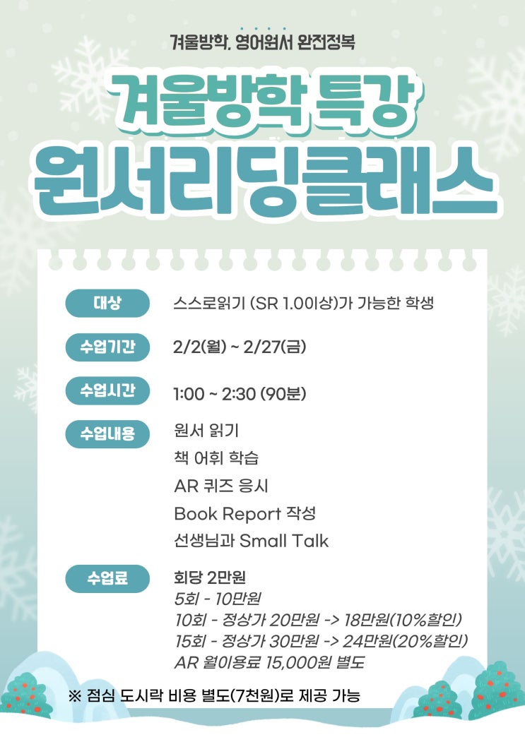 대상: SLP LV. NHK 2 이상 또는 SR 1.0 이상의 혼자읽기가 가능한 학생 수업내용 : 영어 원서읽기 -> 책에 나오는 어휘학습 -> AR퀴즈응시 -> 북리포트 작성 -> 선생님과 1:1 책리뷰토크 수업기간: 2월 2일(월) ~ 2월 27일(금) 수업시간: 오후 1시 ~ 2시 30분(90분) 수업료: 회당 2만원 5회 - 10만원 10회 - 정상가 20만원 -> 18만원(10%할인) 15회 - 정상가 30만원 -> 24만원(20%할인) 신청방법: 구글폼으로 신청서 제출 또는 학원으로 전화접수 (☎ 473-1234) < 구글폼 신청서 > https://forms.gle/XLZ4gsuEhoRzGvN78 ※ 특강기간 내에서 원하는 날짜만 횟수수업 가능합니다.(회당 2만원) ※ AR프로그램 미이용자는 SR....... <img src="https://blogthumb.pstatic.net/MjAyNTEyMDNfMjg5/MDAxNzY0NzQ2NDQ4OTMw.SyP5-LnA6Id6imHMQ0RgeNwEYAi_LgGvj0fINzkEicYg.KPMoo-2GrxlhvC5yz151uS9RhkSJRgNzkwcpQ3xTTSkg.JPEG/%C1%A6%B8%F1%C0%BB_%C0%D4%B7%C2%C7%D8%C1%D6%BC%BC%BF%E4._%283%29.jpg?type=s3" />