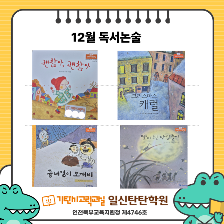 벌써 한해를 마무리하는 12월입니다. 12월의 첫주는 독서논술 시간이었습니다. 5세반 친구들은 [괜찮아 괜찮아]를 읽고 친구와 좋은 것을 나누고 감사하는 마음에 대해 생각해 보았습니다. 6세반 친구들도 [크리스마스 캐롤]을 읽고 이웃을 생각하는 크리스마스에 대해 이야기해 보았습니다. 초1반 친구들은 [흉내쟁이 도깨비]를 읽고 나무꾼 부부의 재치와 지혜를 배우며, 만약 나라면 어떻게 했을지 생각해 보았습니다. 초2반 친구들은 [별이 된 반딧불이]를 읽고 인내와 노력으로 꿈을 이룬 반딧불이를 생각하며 자신의 꿈에 대해 이야기 해보는 시간을 가졌습니다. 한 해를 마무리하는 뜻깊은 시간이었습니다. #학원 #코딩 #초등 #일신동 #수....... <img src="https://blogthumb.pstatic.net/MjAyNTEyMDVfNzcg/MDAxNzY0OTM2NjQzODEw.55uyG1mzJhO-hVq4psdhxAVTY2srQR71h9V2dogvmkQg.l_swXCIAuE8KHexKG3rogfq7fiRMGpd4EjDQxyJ0x-wg.PNG/900%A3%DF%C1%A6%B8%F1%C0%BB%A3%AD%C0%D4%B7%C2%C7%D8%C1%D6%BC%BC%BF%E4%A3%DF%A3%DF%BA%B9%BB%E7%BA%BB%A3%AD001_%A3%AD_1.png?type=s3" />