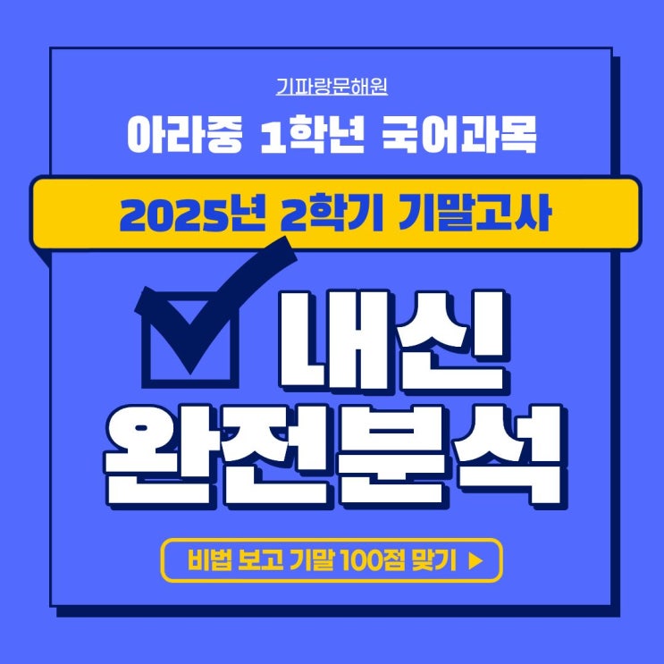 안녕하세요, 기파랑문해원입니다. 이번 아라중학교 1학년 2학기 기말고사 결과를 분석한 결과, 기파랑 수업 내용과의 적중률이 무려 96~97%에 달했습니다! 이처럼 기파랑문해원의 수업에서 다룬 내용들이 실제 시험에 출제되었습니다. 시험 총평 이번 아라중 1-2 기말고사는 다음과 같은 특징을 보였습니다. 1. 문법 영역의 높은 비중 품사 개념을 정확히 이해한 학생과 그렇지 않은 학생의 점수 차이가 크게 나타났습니다. 자료 제시형 문제가 출제되어, 제시문을 읽고 조건에 맞게 분석·적용하는 능력이 중요하게 작용했습니다. 2. 소설 작품의 구조적 이해 요구 단순 줄거리 암기를 넘어선 문제가 출제되었습니다. 따라서 갈등 전개....... <img src="https://blogthumb.pstatic.net/MjAyNjAyMDZfMTc1/MDAxNzcwMzY3NTUwMDMy.GfURE6o5cJYJS6v4lo7Nv7G4pXD_p45admh6FVOfockg.zRQWKQosbGKnwl9OlZdTSUXhPGuF0ccltpW_IzHqKZIg.JPEG/1.jpg?type=s3" />