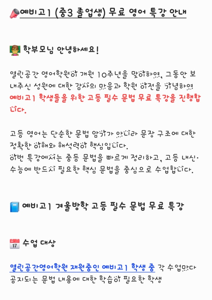 드디어 기다리고 기다리던 2026학년도 왓슨어학원만의 특별 프로그램 "FINAL 자소서 + 면접 프로그램"을 개강합니다. 다년간 특목고를 보낸 입시 실적과 왓슨 입시연구소 매튜 부원장만의 노하우를 결합하여 준비하였습니다. 보다 자세한 사항은 블로그글을 참조해 주세요. https://blog.naver.com/watson1way/224058944502