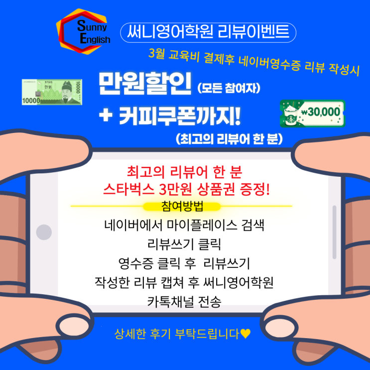 안녕하세요! 오늘 영어도 맑음! 써니영어학원입니다. 1년에 한 번 진행하는 네이버리뷰이벤트가 돌아왔습니다!! 예쁜 아이들을 믿고 보내주시는 학부모님들을 위해 매년 감사이벤트로 리뷰이벤트를 진행하고 있는데요! 그동안 정말 많은 학부모님께서 참여해주셨어요:) 올해도! 3월 원비결제 영수증으로 참여해주시는 모든 학부모님들께 4월 원비 만원 할인! ( 타할인과 중복 가능 ) + 이번에는 특별히 최고의 리뷰어 1분께 스타벅스 3만원 상품권을 증정할 예정입니다:) 이벤트 기간: 2026.02.11-3.31 최고의 리뷰어 당첨자 발표일: 2026.04.01 참여 방법 1. 교육비 결제후 영수증을 받는다. (온라인 결제시 카톡으로 영....... <img src="https://blogthumb.pstatic.net/MjAyNjAyMTFfNTkg/MDAxNzcwODAxNzQwNDA4.EmRhNf2-iVIpVEmu8MUpaNbx4S2fJvNsnP4aroigFrkg.SRwRAI8-ddU9K-XyfdZFLQffes79v3GLtFU67E8IomUg.PNG/%B8%AE%BA%E4%C0%CC%BA%A5%C6%AE_%C3%D6%C1%BE%BA%BB.png?type=s3" />
