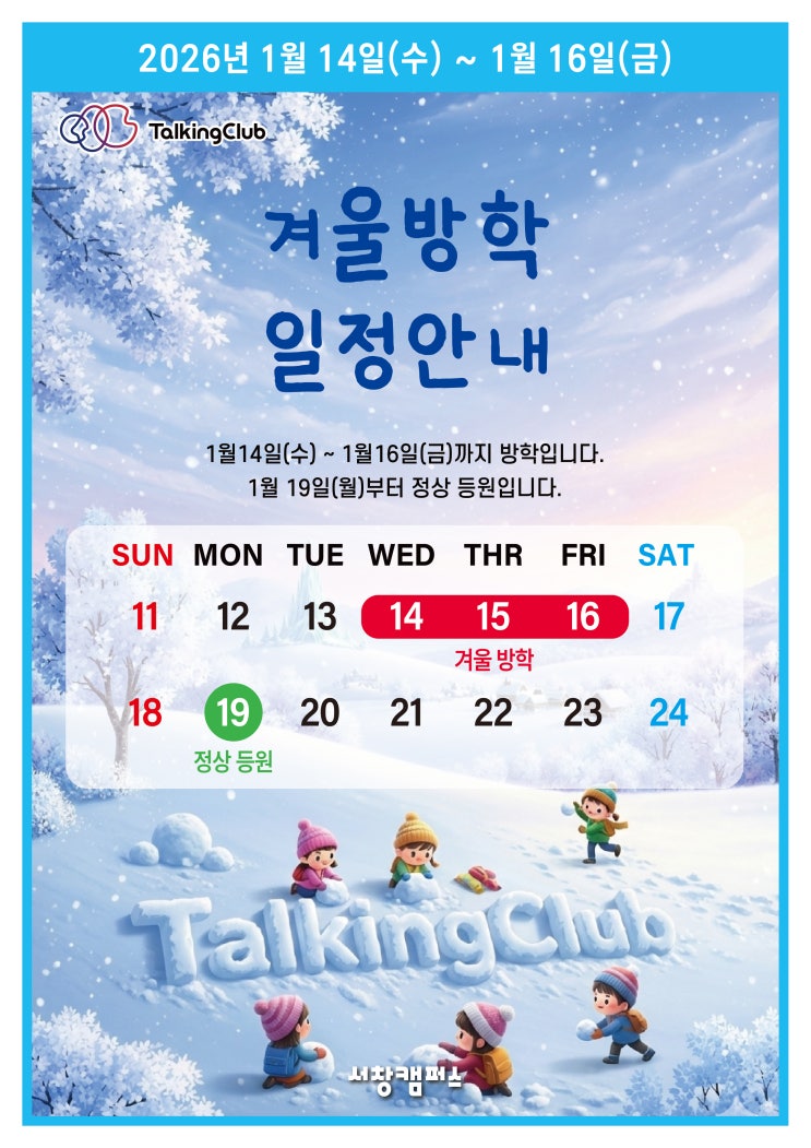 안녕하세요. 이보영의 토킹클럽 서창어학원입니다. 저희 학원은 **1월 14일(수) ~ 1월 16일(금)**까지 겨울방학에 들어갑니다. 잠시 쉬어 가는 시간을 통해, 아이들이 더 즐겁게 배우고 꾸준히 성장할 수 있는 새 학기 수업을 차분히 준비하고자 합니다. ✨ 1월 19일(월), 다시 밝은 모습으로 만나요. 또한 1월 19일(월)부터 3월 9일 개강 예정인 Phonics 반 상담이 시작됩니다. 아이의 첫 영어가 중요한 만큼, 놀이와 학습의 균형을 갖춘 커리큘럼으로 부담 없이 시작할 수 있도록 준비하고 있습니다. 개강 관련 자세한 안내는 1월 19일부터 순차적으로 안내드릴 예정입니다. 관심 있는 학부모님께서는 편하게 문의 주세요. 아이의 성장을 믿고....... <img src="https://blogthumb.pstatic.net/MjAyNjAxMTNfMjg3/MDAxNzY4MzAzMzc0ODk4.MHSPU08YPDAD8M9Ebc5NvBwV4PLOBMxgtjni0pELdbcg.u9UveB1GE-y9Ek6Uee7a7RAh_-vVum0GKNVifSh39Gcg.JPEG/26%B3%E2_%B0%DC%BF%EF%B9%E6%C7%D0.jpg?type=s3" />