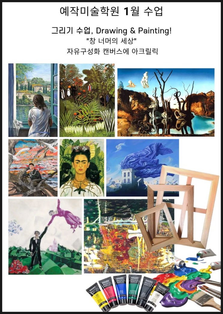 안녕하세요! 인천 용현동 유아/초등 전문 '누구든 예술가가 될 수 있는 곳' 예작 미술학원입니다. 2026년의 문이 활-짝 열렸습니다. 먼저 새해 복 많이 받으세요♥ 예작은 스케치북이 아닌 수업마다 목적이나 분위기에 맞는 크기의 캔트지에 그림을 그려왔습니다. 하.지.만 이번에는 종이를 넘어서 더 큰-크기의 캔버스에 아이들의 상상을 가득 담아 보다 크고 완성도 높게 그려보고자 캔버스 아크릴화를 준비했습니다. 아이들이 커서 돌아보면 유년기의 소중한 작품으로 남지 않을까 생각하며 열심히 수업하고 있습니다. 주제는 "창 너머의 세상"으로 살면서 이따금 했던 상상... '어느 날 창 밖에 00이 있었으면 좋겠....... <img src="https://blogthumb.pstatic.net/MjAyNjAxMTZfNTgg/MDAxNzY4NTYxNzE2NjM4.YH7IwJqQC7NE6BZLDFSd0FYlWryM7idPye-2xQoNGuEg.LIWKM8nbb2VceB3b4x2nqUeyDv8bEIMHWwdSjRK_e-Mg.JPEG/%BF%B9%C0%DB_%BC%F6%BE%F7_%C4%BF%B8%AE.jpg?type=s3" />