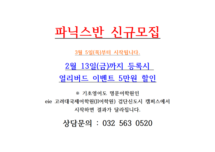 파닉스 기초영어 어디서 시작해야될지 고민하시는분들께 명문영어학원인 eie고려대국제어학원 검단신도시캠퍼스를 소개합니다.!~ 3월5일(목)부터 시작되는 파닉스 기초영어 신규반 2월13일(금)까지 등록시 얼리버드 이벤트 5만원 할인됩니다. 상담문의 0325630520 아이의 첫 영어, 파닉스부터 '제대로' 시작하세요~~ 검단신도시영어학원의 리더인 EIE 고려대국제어학원(JI어학원) 파닉스 기초영어 신규반 3월 5일 개강합니다.~ 파닉스 레벨은 쉬운거 같은면서도 제대로 잡혀지지 않을 경우 앞으로 이어져야 할 영어학습을 어렵게 만들수도 있는 영어의 시작점인 레벨입니다. 영어를 잘하는 아이들은 모두 '소리로 읽는 법'을....... <img src="https://blogthumb.pstatic.net/MjAyNjAxMjBfNCAg/MDAxNzY4ODk0NDQ5NjI4.W_8SFyj5QKHJy1hlTENocqr8cYQBj51hAL0eKrbEBCAg.ya17i0ixAJhXg4LYLgmSv8ySdh_Dyda6kc7GKY7YTSwg.PNG/KakaoTalk_20260115_152434151.png?type=s3" />