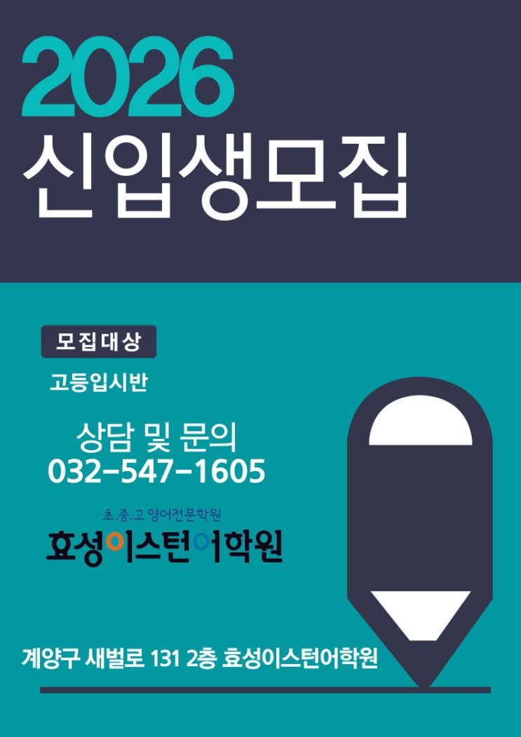 <신규 고등부 기초 및 고등부 심화반 모집안내> 안녕하세요 효성이스턴어학원 Kevin T입니다! 신학기 맞이 문법 기초 및 내신심화 고등부 원생을 모집합니다. 효성고, 작전여고, 안남고 등 새롭게 고등학교에 배정 된 학생들에게 22개정에 발 맞추어 글의 이해를 돕고, 맥락, 문법에 특화 된 교육이 준비되어 있습니다. 자기 주도 학습을 통해 학습이 필요한 아이들 겨울방학동안 영어 학습에 준비가 필요한 아이들 지금부터 효성이스턴어학원과 함께 해보시면 어떨까요? 어머님들의 믿음에 24년 째 한자리에서 보답드리고 있습니다. 효성이스턴어학원 032-547-1605 <img src="https://blogthumb.pstatic.net/MjAyNjAxMjNfMTAx/MDAxNzY5MTQ3ODk0MjE1.jmQG0Kj0JuNSRPL_7RB_hSs-NNW9ctWU8AUXA3srXiIg._aqHjJhoGG9EoLtU2VHjYBf0rRPjhYAy4voHfU1s-6kg.JPEG/%C1%A6%B8%F1%C0%BB-%C0%D4%B7%C2%C7%D8%C1%D6%BC%BC%BF%E4_-001_%287%29.jpg?type=s3" />