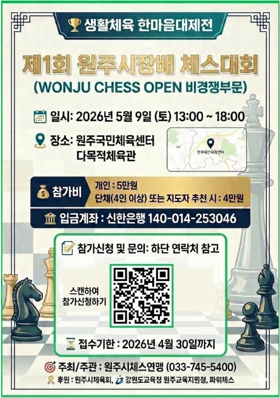 안녕하세요, 청라체스 체스런입니다. 우리 아이들의 생각하는 힘을 길러주는 체스, 오늘은 체스에 막 흥미를 붙인 아이들이 부담없이 참가하기 좋은 대회가 있어 소식을 전해드립니다. 다가오는 5월에 개최되는 '제1회 원주시장배 체스대회'인데요, 승패의 부담을 덜어낸 "비경쟁부문"으로 진행되어 첫 대회 경험으로 추천해 드립니다. 대회 개요 및 상세 일정 가족들과 주말을 활용해 다녀오기 좋은 일정으로 구성되어있습니다. 대회 일시 : 2026년 5월 9일(토) 13:00 ~ 18:00 대회 장소 : 국민체육센터 다목적 체육관 대회명 : 생활체육 한마음 대제전 제1회 원주시장배 체스대회 영문명 : 2026 WONJU CHESS OPEN(비경쟁부....... <img src="https://blogthumb.pstatic.net/MjAyNjAzMjBfNzIg/MDAxNzczOTY4NjE4NTA2.E9rCMt_us4RysHqQM_BFDcb2UadQ4Ys5Ioc-o51QvjEg.0Exf79IP6OD-AxBiClQT7RZUl5LQE43oWI6srNCm7DUg.PNG/20260430_%BF%F8%C1%D6_%C3%BC%BD%BA%B4%EB%C8%B8.PNG?type=s3" />