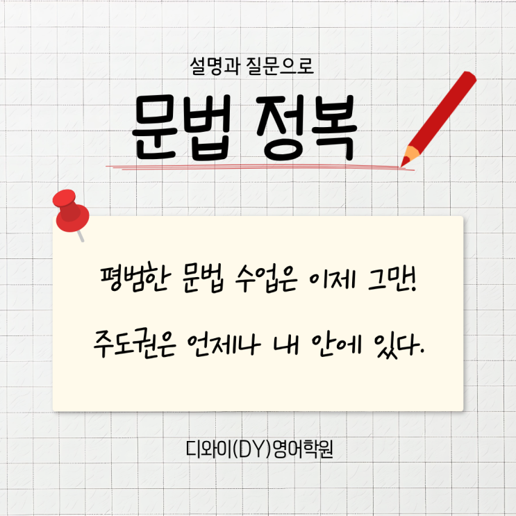 영문법 정복= 독해 프리패스 "우리 아이, 단어는 많이 아는 것 같은데 왜 긴 문장만 나오면 해석이 어려워할까요?" 안녕하세요^^ 디와이 영어 '디와이 쌤'입니다. 많은 아이들이 단어를 조합해 '소설'을 쓰듯 독해를 하곤 합니다. 하지만 문법이라는 설계도가 없다면 독해는 늘 감에 의존할 수 밖에 없죠. 오늘은 영문법 정복이 아이들의 독해 실력을 어떻게 뒤바꾸는지 이유를 알아보려고 합니다. 1️⃣ 문장의 '뼈대'를 보는 눈이 생깁니다. : 문법이 잡히면 주어,동사, 목적어를 정확히 구분해내는 **문장 구조 분석**이 가능해집니다. 아무리 긴 문장이라도 수식어구를 걷어내고 핵심 의미를 파....... <img src="https://blogthumb.pstatic.net/MjAyNjAyMDhfMTgz/MDAxNzcwNTQxNTI5NzQ1._RAfd5MS2D_XI5a1E--nmqo1txbIyGaLDX55Mc3Z2P4g.VvtWpAhzP3seNsQt4Iu4Tj_ZNL6MKAMN6mVRdB6lHzIg.PNG/%B9%AE%B9%FD.png?type=s3" />