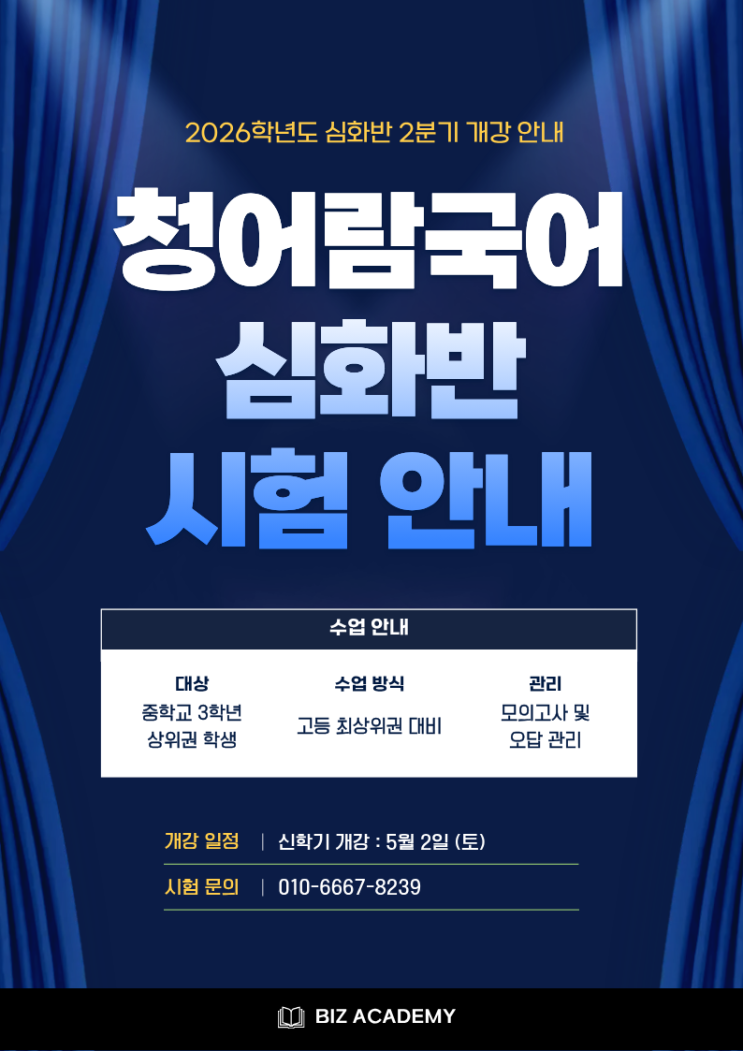 안녕하세요~ 청어람 국어학원입니다:) 2026년 5월부터 고등 최상위권과 메디컬 진학 대비를 위해 중등부 심화반 2분기 수업이 시작됩니다. [중3 심화반 안내] 대상 : 재원생 및 신규생 학년 : 중3 인원 : 10명 (점수에 따라 인원을 채우지 않을 수 있습니다.) 시험일정 : 4/7(화)~4/25(토) (시험 응시료 : 재원생(무료), 신규생(1만원)) 수업기간 : 2분기 5, 6, 7월 수업시간: 토요일 6:30-9:30 * 4월 26일 시험 마감 및 성적 산출 후 공지됩니다. * 시험 가능 시간 : 주중(월요일 제외) 4:00-8:30, 주말 토요일 1:30-7:30 일요일 10:00-4:30 (시험 시작 시간 기준, 약 1시간 15분 소요 예정) * 시험응시 가능한 날짜 및 시간을 문자로 양식 꼭 맞....... <img src="https://blogthumb.pstatic.net/MjAyNjAzMjhfMTgg/MDAxNzc0Njc3MjMxMjg4.fuE8ShDsRdaQUenKKYP0NmTIl81YWnAsnfYy5aYkFBgg.meVHVGgcX5HSPZTSblADpxlqh_h4dJJ4kDtbj7wSy24g.PNG/%BD%C9%C8%AD%B9%DD_%C0%CC%B9%CC%C1%F6.png?type=s3" />