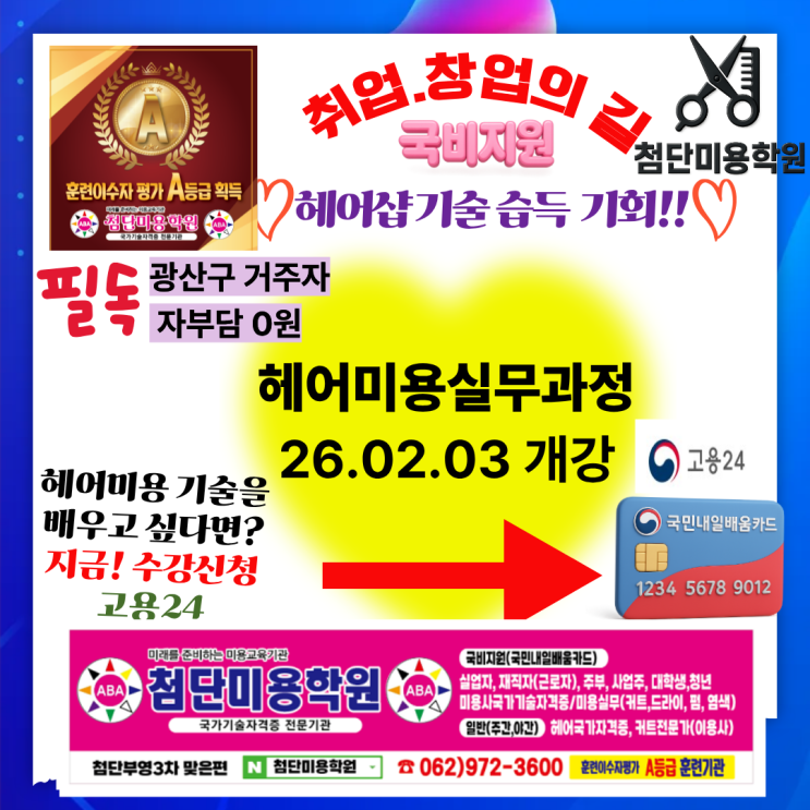 안녕하세요 『 함께 성장하는 최고의 미용 파트너 교육기관! 』 첨단 미용학원입니다 : ) 난생 처음 이·미용을~ 어디에서 배웠어요? 2/28일까지 광주 광산구거주자는 자부담0원으로 교육훈련이 가능합니다. 헤어미용실무과정 2/3일 개강 2/3~3/26 (1일 6시간) 34일 동안의 열정을 담아 ★열심히 출석해서 기쁘게 출근하자★ 지금! 고용24 수강신청 "첨단미용학원" 입니다. 기ㅣ본를 탄탄하게 하여 안정적인 태도로 헤어미용을 접근한다면 더 재미있고! 더 신바람 나고! 놀랍게 할 수 있습니다. << 내 손끝은 기억하고 있습니다.>> <img src="https://blogthumb.pstatic.net/MjAyNjAxMjhfMTk0/MDAxNzY5NTY4Mjk3ODMx.Oq_o-HHLz9iSvJDxFmijTSbV63idky0qe__tsKSINtMg.mstY6mf_CsLZn4RbXuojLWLuRdqH3667tjoWj8mhCGkg.PNG/260203%C7%EC%BE%EE%BD%C7%B9%AB1_%281%29.png?type=s3" />