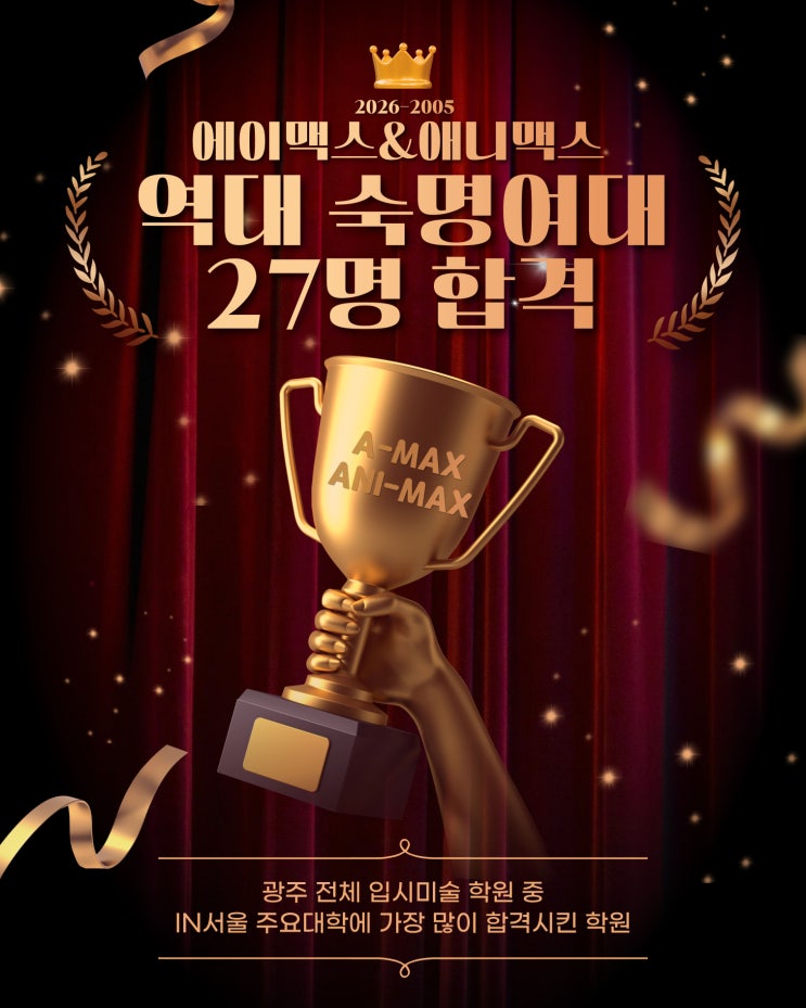 [에이맥스 미술학원] 숙명여자대학교 합격자 공개 역대 27명 합격!!! (2005-2026) [광주입시 미술학원] 안녕하세요! 에이맥스 미술 학원입니다 ><!! 오늘은 숙명여자대학교 역대 합격자 소식을 들고 왔습니다! >⩊< [숙명여자대학교] 역대 합격생 27명! 2026학년도 정시, 지원자 2명 전원 합격! (100% 합격!!) 올해 숙명여대 정시에서는 단 2명이 지원하여 2명 모두 합격하며 지원자 대비 100% 합격이라는 멋진 결과가 있었습니다 ~!! ▶ 산업디자인과 임O원(광O여고 3) 합격! ▶ 공예과 양O성(숭O고 3) 합격! 힘들었던 시간들을 이겨내고 당당히 합격한 우리 에맥 친구들 넘 멋있고 대....... <img src="https://blogthumb.pstatic.net/MjAyNjAyMDNfMjAx/MDAxNzcwMTExNzc5NTQ1.wsD1KmiTLSYUbLAoomW4an3FQOOnfmEk7Qd5b7OofVIg.8eVcv74I4EyM6BZqpNp5OwjZnGGLat7s-lzZRrfKM0Ag.JPEG/%BC%F7%B8%ED%BF%A9%C0%DA%B4%EB%C7%D0%B1%B3%BF%A1%C0%CC%B8%C6%BD%BA%BF%AA%B4%EB%C7%D5%B0%DD%C0%DA%C0%CE%BC%AD%BF%EF2.jpeg?type=s3" />