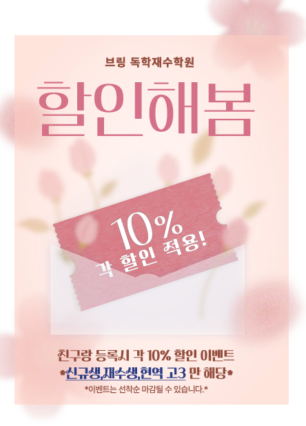 대상 : 브링 재수학원 ,재수생 ,현역고3 친구/지인 과 등록시 각 10% 할인 적용 ! 가족/장기 추가 할인 적용됩니다^^ 2027 중요한 수능 오픈 4년 차 관리 잘하는 독서실 브링 독학재수학원 #관리형독서실 #김포재수학원 #김포관리형독서실 <img src="https://blogthumb.pstatic.net/MjAyNjAzMjFfMTc0/MDAxNzc0MDc0MjI0MjM1.l2pq0jHCjsc42bq1mlKDcGd8oB7P6hUKA1ZC6vj8ohUg.5OOd6D0udMHaAme7t65avdYrLPJO7GdWTvk1TxtCWUEg.PNG/IMG%A3%DF4312.PNG?type=s3" />