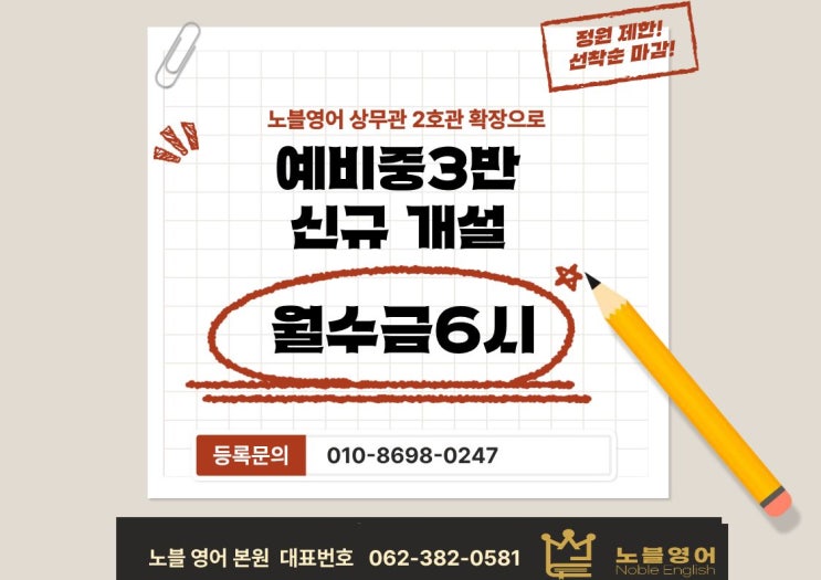 노블영어, 상무관 2호관 확장 오픈! 예비 중3 월수금 6시 클래스 안내
