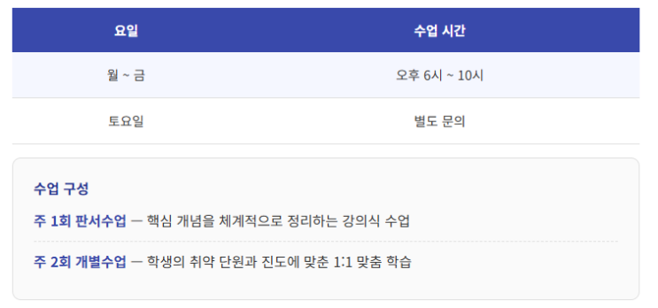 더몬스터학원 2026년 수업 시간표 안내 소수정예 맞춤 수업 | 초등 · 중등 · 고등 안녕하세요, 더몬스터학원입니다. "우리 아이한테 딱 맞는 수업이 있을까?" 새 학기가 시작되면 많은 학부모님들이 이런 고민을 하십니다. 더몬스터학원은 소수정예 맞춤 수업을 원칙으로 운영하고 있어, 학생 한 명 한 명의 수준과 속도에 맞춰 수업을 설계합니다. 대형 학원에서 놓칠 수 있는 우리 아이만의 약점, 여기서는 절대 놓치지 않습니다. 초등부터 고등까지 학년별 시간표를 안내드리오니, 참고해 주시기 바랍니다. 초등부 시간표 위 시간 내에서 학생별로 수업 시간을 배정해 드리며, 상담을 통해 가장 적합한 시간대를 함께 정합니다. 수....... <img src="https://blogthumb.pstatic.net/MjAyNjAzMzFfOTYg/MDAxNzc0OTU4Mzk5NDk5.l0_h2h3-kGuYtjP0jkNB_lUT1Ji31tJcTUgElWVF0mMg.A9MDykNj9KH_GvY_zzU9j7ebNPLUP2wc_J5NzQgr4h0g.PNG/image.png?type=s3" />