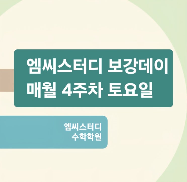 엠씨스터디 보강수업은 어떻게 진행되나요? 학생 개인 사유에 의한 보강은 매월 4주차 토요일에 상시 운영합니다. 질병, 여행, 가족 행사 등등 개인사유로 결석을 하면 아래와 같이 안내드립니다. 오늘 빠진 수업은 초등부 보강데이에 진행하겠습니다! (매월 4주차 토요일 상시 운영) 3월 보강데이 일정 안내 : 3/28 토요일 11시 - 2시 운영. 스케쥴 미리 챙겨 주세요! 한달동안 결석한 초등 친구들은 4주차 토요일 보강데이에 수업을 오면 됩니다. 보강수업은 데일리 테스트 진행하지 않습니다. 숙제는 가지고 오지 않아도 됩니다. 정규수업의 80~100%진행합니다. 보강에 재보강은 없습니다. 아래 사진은 지난 2월 보강데이 교실입니다. 보강데....... <img src="https://blogthumb.pstatic.net/MjAyNjAzMDlfMjQg/MDAxNzczMDY3MTYwNzcy.E4q2GDZkrrLw1LO9xFx5EQB3uM_c_iMLm0CT3BkLVfgg.zDuh-xeCYiiI4oED2sxkTEC3ShYllvF3y3cE7RLXU8Eg.JPEG/900%A3%DF1768019969545.jpg?type=s3" />