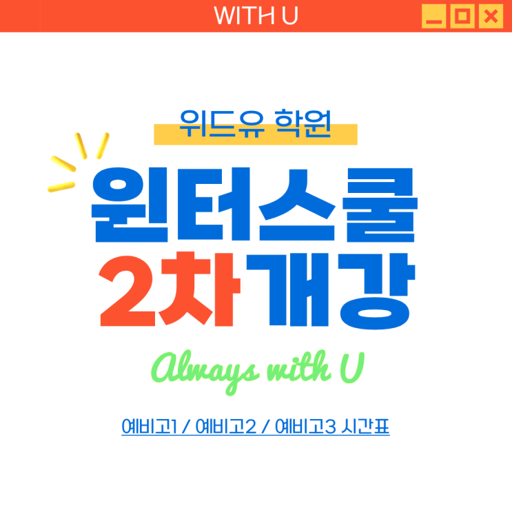 안녕하세요 위드유 학원입니다! 겨울방학은 짧지만, 고등 수학의 흐름을 정리하고 다음 학기를 준비하기에 가장 중요한 시기입니다. 벌써 1월 특강의 절반이 지났습니다! 매일 수업에 빠지지 않고 출석한 우리 학생들 정말 많이 칭찬하고 싶습니다! 2월 특강 문의가 많아 자세하게 작성했고 2월 특강안내 시작합니다!! 위드유학원에서는 예비고1·예비고2·예비고3 학생들을 대상으로 수준별·과정별 윈터스쿨을 운영합니다. 단순 선행이 아니라, 개념 정리 → 기출 적용 → 심화 클리닉까지 연결되는 구조로 진행됩니다. 예비고1 2차 윈터스쿨 기간: 2월 1일(월) ~ 2월 23일(수) / 3주 완성 시간: 오전 9시 ~ 12시 + 오후 클리닉 과목: 공통수....... <img src="https://blogthumb.pstatic.net/MjAyNjAxMThfMjc4/MDAxNzY4NzM3NTE1MzA0.OkURbn4re9KQ82fwIwES-G51VrlF1TcuHsp7-VzQcS4g.YwIW3NQ6rCZVChLYzJqTuTLj9VwW_WCAS5GztY0xR6Ag.PNG/KakaoTalk_20260118_192633724.png?type=s3" />