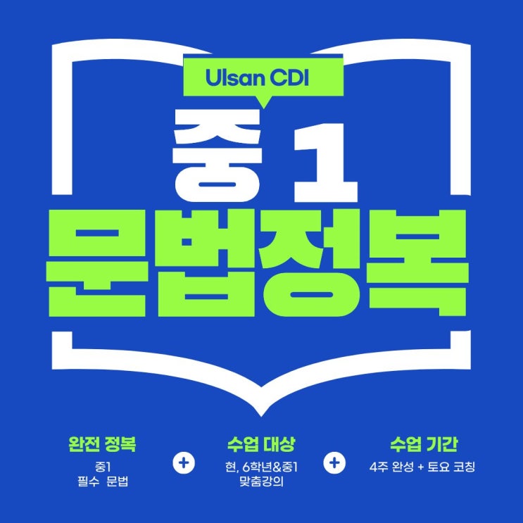 안녕하세요. 울산 청담어학원입니다. '중학교 가기전, 문법을 조금 이라도 해야 하지 않을까?' '이제 중학생됐고, 곧 영어 시험이 있을텐데 문법 이대로 괜찮을까?' 학부모님의 고민을 고려한 특급 플랜을 오픈합니다!! "4주 중1 문법 정복" 매주 토요일 문법코칭 클래스 3월 28일(토) 부터 시작 ~ 4월 18일(토) 까지 진행 (세부일정 : 3/28, 4/4, 4/11, 4/18) 오전 11시 ~ 오후 1시까지 2시간 수업 일정 (차량은 따로 없이 개별등원) ★ 대상은 현, 6학년 & 중1 학생들!! ★ 수강료는 100% 무료 이벤트 로 이루어집니다!! (교재준비는 미포함-개별준비) ※ 4주 문법 수업 계획표 수업전 약속이 있어요~ 무....... <img src="https://blogthumb.pstatic.net/MjAyNjAzMTNfMzYg/MDAxNzczMzk1MDQ5Njc2.MWQHGmzbZIHRodrAVs4GDC3TB9rkF4piPeF0kk8XLOYg.TgY7jJ_oWq6qBybmLlz7wlOMgqTOqx85K27GAQWRpmgg.JPEG/%B9%AE%B9%FD%BD%E6%B3%D7%C0%CF.jpg?type=s3" />