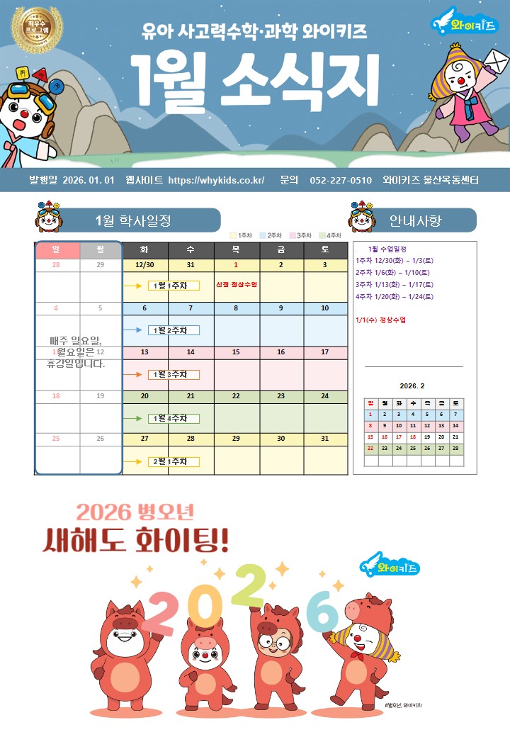 병오년이 밝아옵니다. 와이키즈는 25년을 조금 일찍 시작합니다. 1월 소식지 전달드립니다. 1월 1주차 12/30(화) - 1/3(토) 1월 2주차 1/6(화) - 1/10(토) 1월 3주차 1/13(화) - 1/17(토) 1월 4주차 1/20(화) - 1/24(토) 1/1(수) 신정은 정상수업입니다. 와이키즈 가족 모두 2026년 건강하시고 좋은 일이 가득하길 기원하겠습니다. 새해 복 많이 받으세요. <img src="https://blogthumb.pstatic.net/MjAyNTEyMjVfNjUg/MDAxNzY2NjM3NjQyMzcy.GQbmlByMLinlB442MqmMwTlhBtI-zYtcD4X4nqJ8uSYg.HRl5EVO-DsEl-39BG-zgZfu3jeQSYQ2mQ-jr4c4eRdAg.JPEG/KakaoTalk_20251225_132103832.jpg?type=s3" />