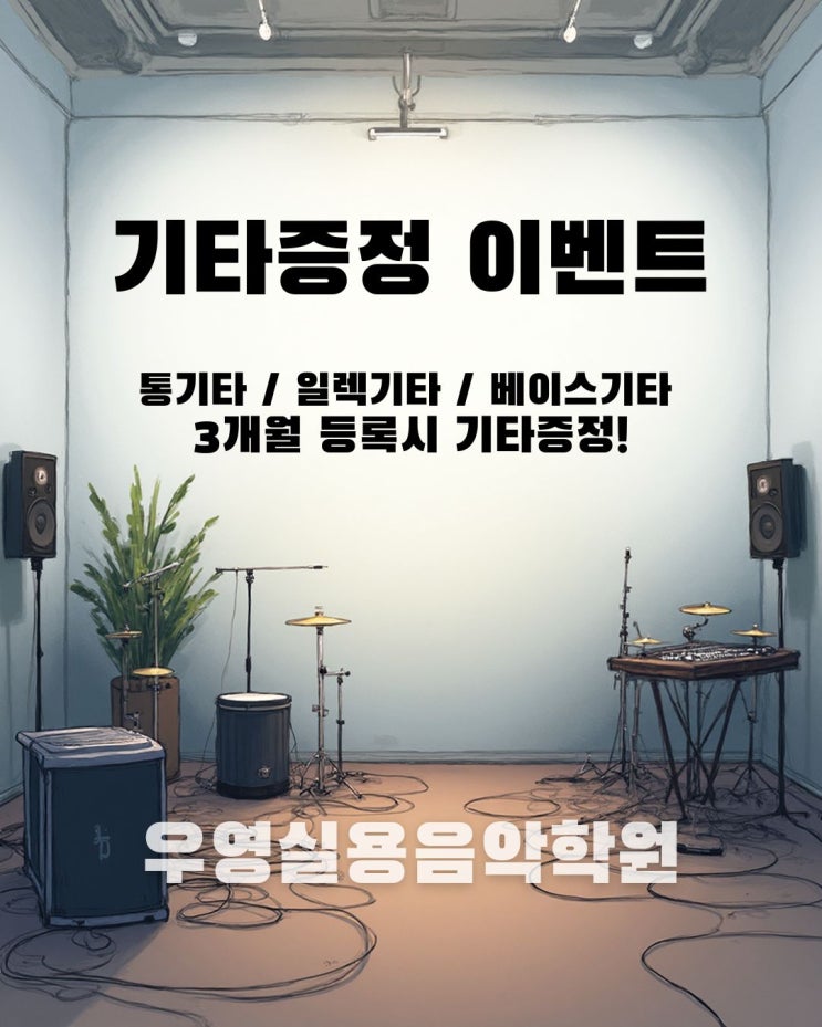 ✨ 신규등록 EVENT ✨ 3개월 등록 시 수강 과목 악기 증정 ✔ 통기타 수강 → 통기타 증정 ✔ 일렉기타 수강 → 일렉기타 증정 ✔ 베이스기타 수강 → 베이스기타 증정 악기 준비 걱정 없이 바로 레슨 시작 가능! 초보자도 OK 전과목 취미 / 입시 / 밴드 수업 가능 기초부터 탄탄하게 배우는 레슨 이벤트 참여 조건 ① 우영실용음악학원 인스타 계정 팔로우 ② 해당 게시글 좋아요 ❤️ ③ 3개월 수강 등록 이벤트 안내 대상 : 3개월 등록 신규 수강생 내용 : 수강 과목에 해당하는 악기 1종 증정 기간 : 이벤트 종료 시까지 (조기 마감될 수 있음) 상담 & 문의 Tel : 0507-1396-5773 E-mail : yae05....... <img src="https://blogthumb.pstatic.net/MjAyNTEyMjFfMjE0/MDAxNzY2MjQ4OTgyMDQy.9g4ZT2vtKAI_L6V96JdFOesVqcQtTnubUO2vyPaxlqYg.Kj74Rk2pGPCMdcly5bgJEmlMd2uzUOExEDfIrUqVJjsg.JPEG/%A4%D3%C5%B8.jpg?type=s3" />