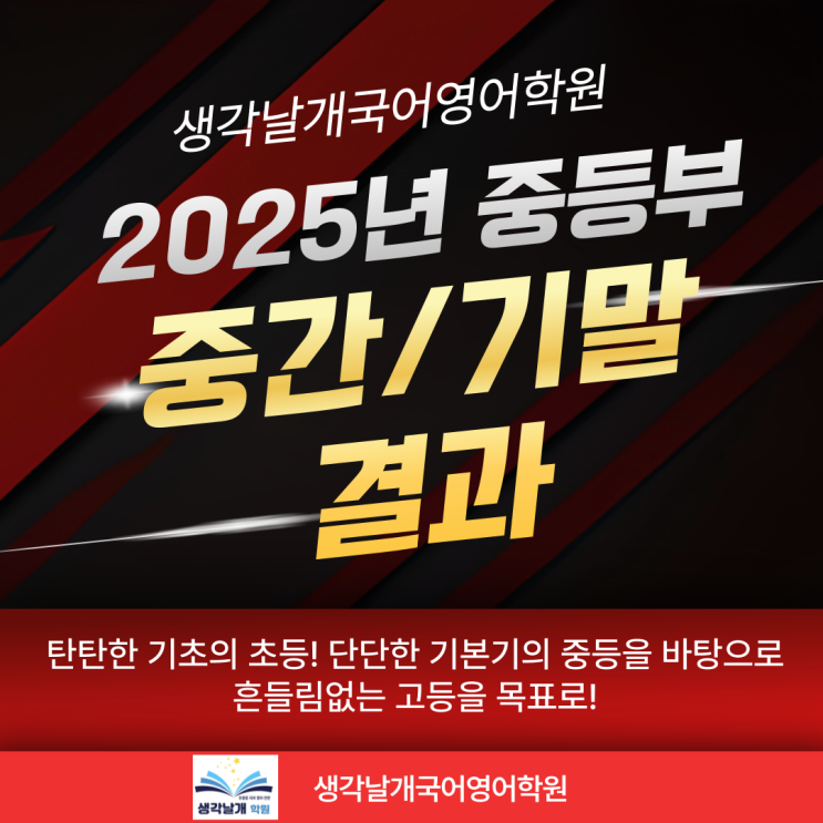 안녕하세요. 생각날개국어영어학원 원장 날개쌤입니다. 생각날개와 함께 중등부 아이들은 매년 4번의 시험을 치르고 있습니다. 생각날개학원에서는 단순히 본문 암기 위주의 시험 대비를 하지 않습니다. 생각날개의 중간고사, 기말고사 대비는 적극적인 수업 참여는 물론, 주어진 과제에 대한 답을 찾아내는 과정을 통해 진짜 자신의 것으로 만드는 과정입니다. 이 시간이 결코 쉽지만은 않습니다. 수많은 유혹(?)들을 뿌리치고 매 중간고사 기말고사 준비를 믿고 잘 따라와 준 생각날개 친구들에게 박수를 보냅니다. 다만 꽃들도 저마다 피는 시기가 다르듯 아이들의 성장도 다 다릅니다. 아이들의 속도에 맞춰 성장할 수 있도록 생각날개가 함....... <img src="https://blogthumb.pstatic.net/MjAyNjAxMDVfMTA2/MDAxNzY3NjAzNDgyNTMz.iGpWt2ynaN577LFKFosQ7Mp1XpHq_b78LuJ9AMjX6x8g.7A7J50pveF2xi4HARaiiaR2FCnrkJ4oYJ1xahFLFpe8g.PNG/%C1%DF%B5%EE%BA%CE%B0%E1%B0%FA.png?type=s3" />