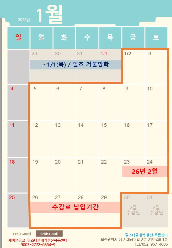 필즈더클래식 2026년 1월 학사일정 안내드립니다. <img src="https://blogthumb.pstatic.net/MjAyNjAxMDZfOTMg/MDAxNzY3NjcyMzYzNDM2.46AsCeEYjdz3TnFqAPlPOhYDGVSjR0ALCvf-wAIrkywg.6W7w6bSGnpHQ_h6svxS39QiC6AQQIzW3okLer17RuJcg.JPEG/1calendar.jpg?type=s3" />