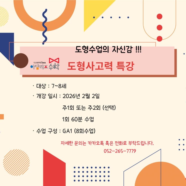 2월 신규반 개강 대상 :7–8세 수학을 어려워하기 전에, 생각하는 힘부터 키워주는 수업이 필요합니다. 아담리즈의 도형사고력 수업은 공식을 외우는 수업이 아닌 보고, 만지고, 생각하며 스스로 깨닫는 수업입니다. 도형사고력, 왜 중요할까요? 7–8세 시기는 ✔ 공간 감각 ✔ 시각적 사고 ✔ 논리적 연결 능력이 빠르게 자라는 시기입니다. 이 시기에 도형을 통해 사고하는 경험을 충분히 하면 ✔ 기하 수학 이해력 ✔ 문제 해결력 ✔ 사고 확장 능력의 기초가 탄탄해집니다. -------------------------------------------------------------------------------------------------------------------------------- ✨ 아담리즈 도형....... <img src="https://blogthumb.pstatic.net/MjAyNjAxMDdfMTE5/MDAxNzY3NzU1Mzg4ODYz.diJYCYlDPZhwqKpJ869yc0K-IVBOjDWFCWrICSafkRIg.7wftobSDCkwdwsB7bHHewiw8cvEzG5shu09S39nTo-sg.JPEG/%BC%F6%B4%C9%B1%EE%C1%F6_%C0%CC%BE%EE%C1%F6%B4%C2_%B5%B5%C7%FC%BC%F6%C7%D0_%C6%AF%B0%AD.jpg?type=s3" />