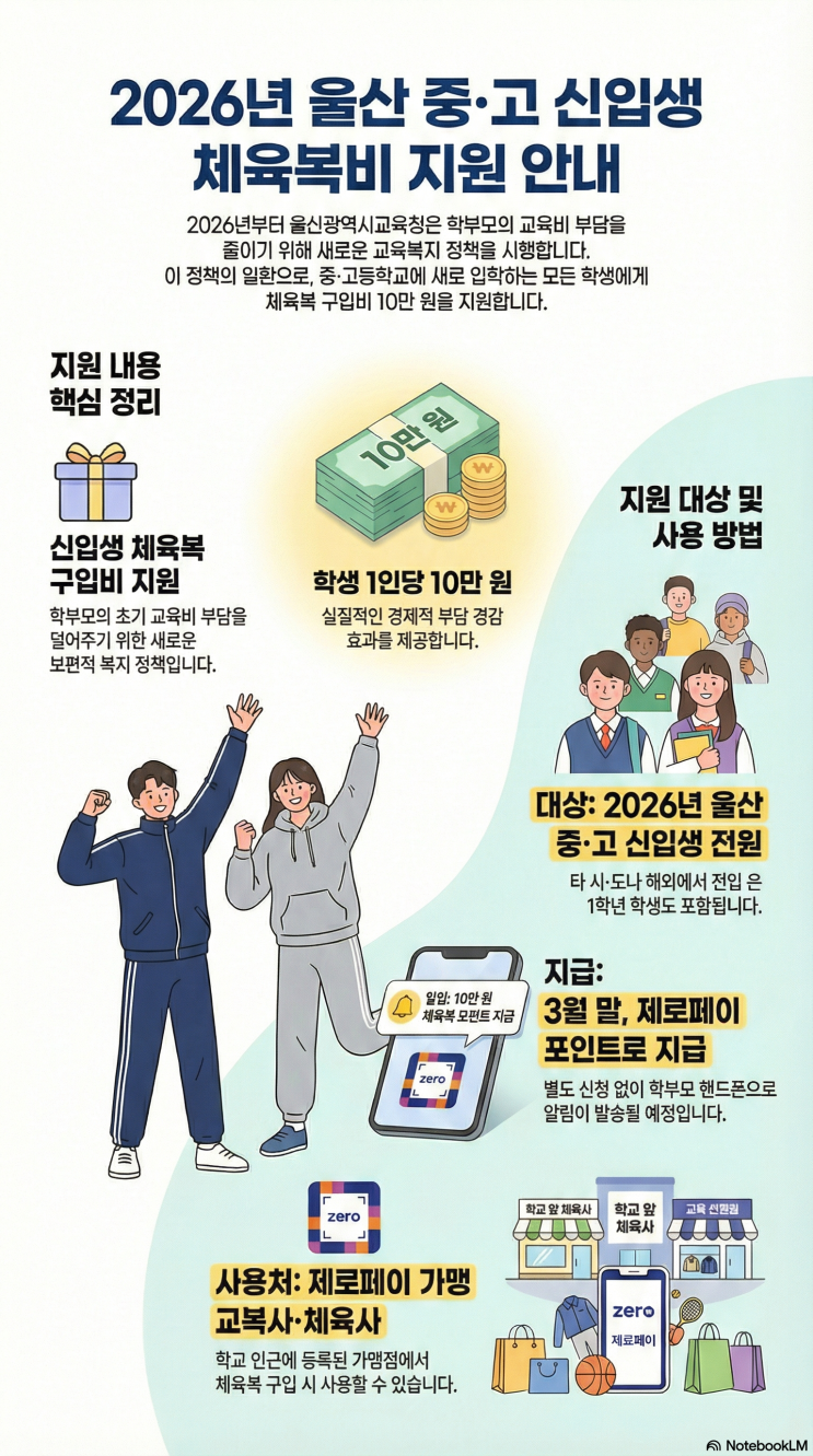 1. 누가 받나요? (지원 대상) 2026학년도 울산 관내 중학교 및 고등학교 1학년 신입생 전원 (특수학교 및 각종학교 신입생 포함) 타 시·도나 해외에서 전입 오는 1학년 학생도 포함됩니다. 단, 학교에서 '단체 체육복'을 입는 학교여야 합니다. (대부분 해당) 2. 얼마를 받나요? 학생 1인당 10만 원 3. 어떻게 받나요? (지급 방법) 지급 형태: 제로페이 포인트 (모바일 상품권 형태) 지급 시기: 2026년 3월 말 예정 주의: 입학식 당일 바로 주는 것이 아니라, 3월 중에 순차적으로 지급될 예정입니다. <img src="https://blogthumb.pstatic.net/MjAyNjAxMTZfMTI5/MDAxNzY4NTY0NzI2OTc0.D3uaWnSd361PrLGJcXlT2nOTtyL0CBhXvjDNdEpr004g.5ADNiufRcWxxVBX6ZKNxp78trueUKiuWWpCfMJ4QGzMg.PNG/unnamed.png?type=s3" />